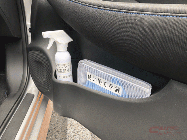 - 車内への除菌用スプレーおよび使い捨て手袋の配備:車内に除菌用スプレー(安定性次亜塩素酸水)、ウェットティッシュ、使い捨て手袋(ニトリルゴム製)を常備。