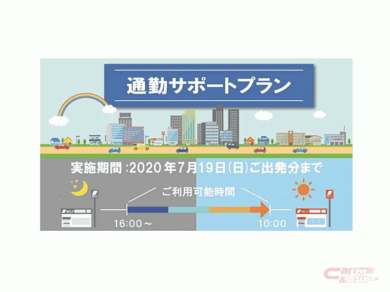 ニッポンレンタカーサービスは、「通勤サポートプラン」として、16時~翌朝10時までの間、お得な料金で利用できる個人向けの「夕方から朝まで割引プラン」と法人向けの「通勤マンスリープラン」が好評のため、 7月19日(日)まで全国の営業所にて延長することを公表した。