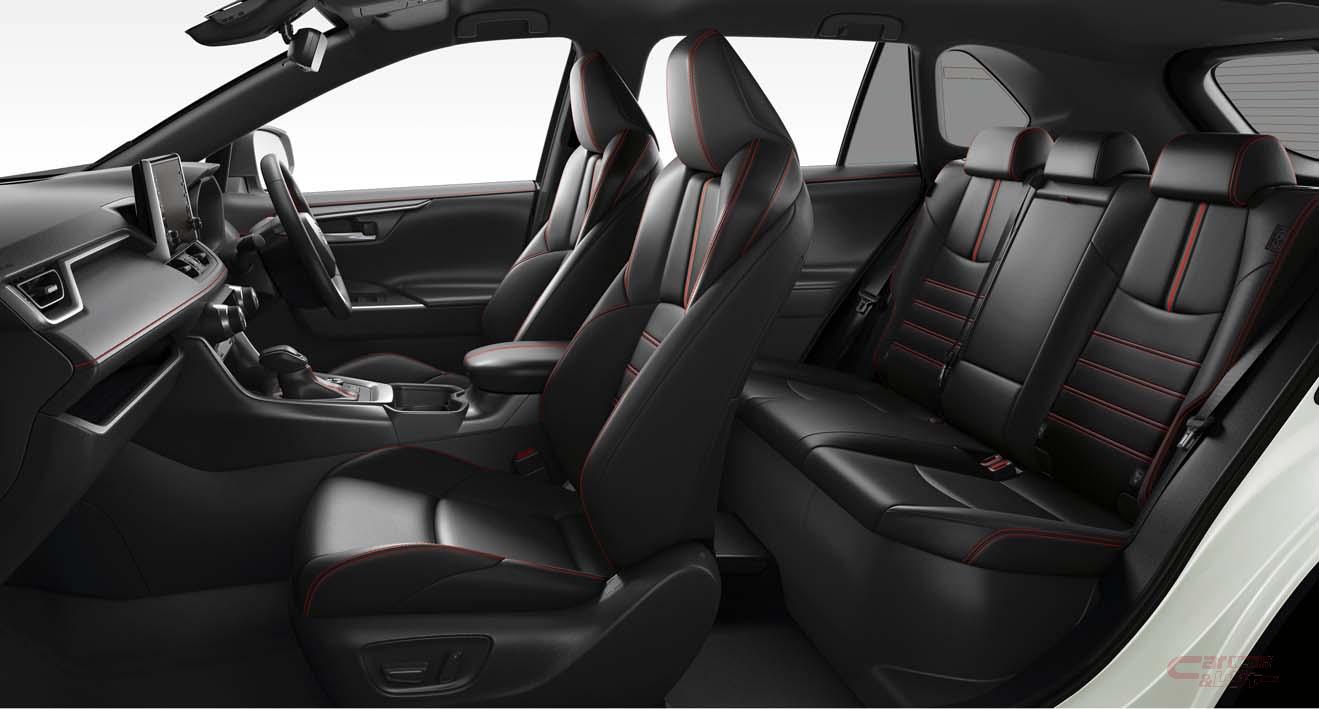 インテリアは天井やピラー、オープントレイ等をブラックで統一。さらに。スポーティさと上質感を醸し出すレッドステッチが施された。シートは合成皮革の表皮を持つスポーティシートを全車標準装備。BLACK TONEとG“Z”には、横基調のキルティング意匠とレッドリボン加飾で上質さの中に力強さを表現した。Gのシートは、ファブリックの通気性と革のような質感を併せ持つレザテックを採用した。