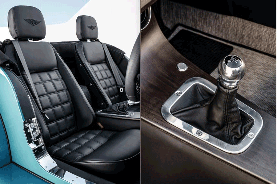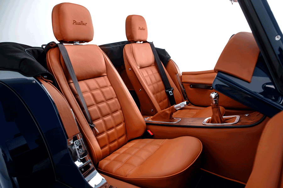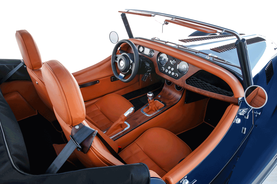センター、刺繍入りヘッドレスト(Morgan ロゴ or Plus Four ロゴ)、コントラストカラーシートステッチング&パイピング