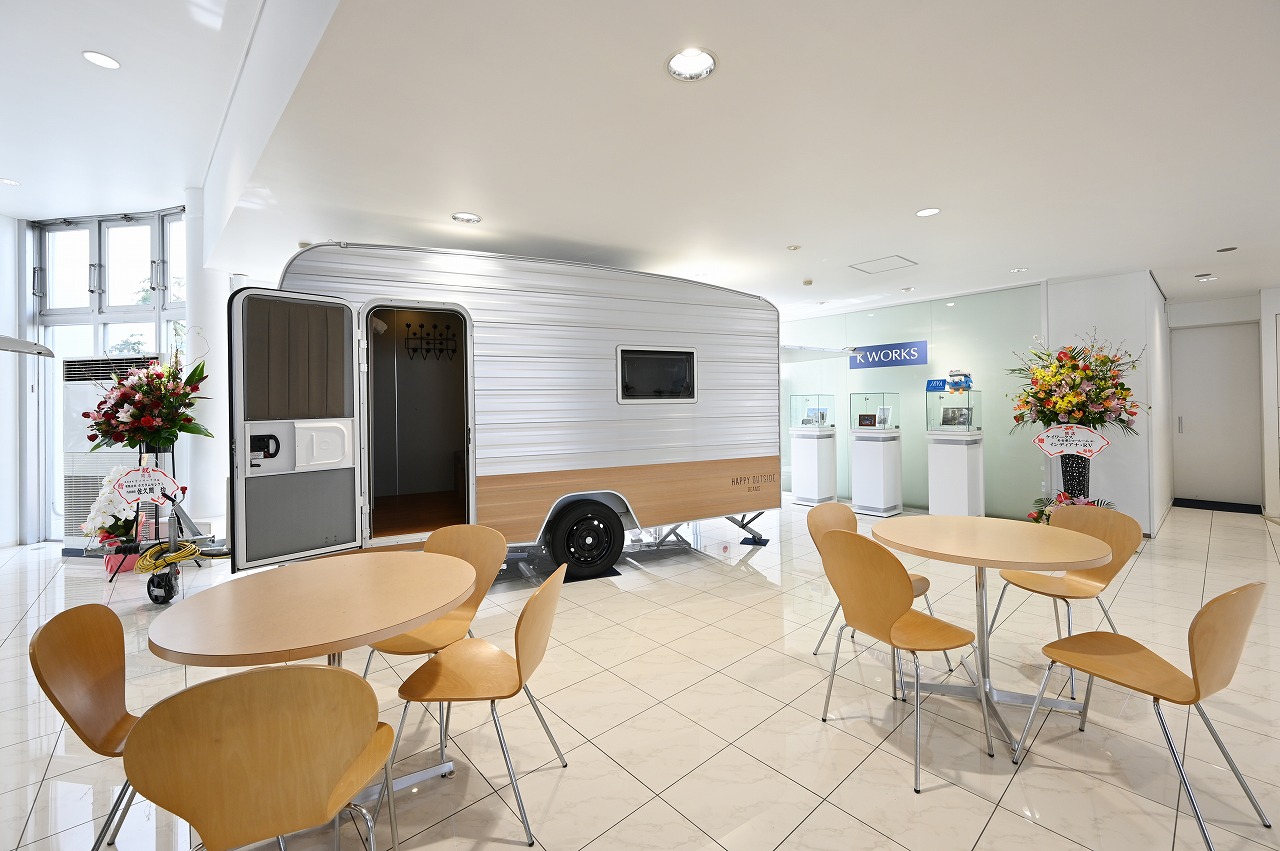 車両展示以外に独立した商談スペース2部屋をはじめ、キャンプ風景を思わせるキッズスペース、ユーザー専用サロンスペースも設けられたほか、キャンピングカーのキッチンを使った調理実演も実施。試乗車も用意され、車両見学にとどまらずキャンピングカーのある暮らしを体感できることも新ショールームの魅力となっている。