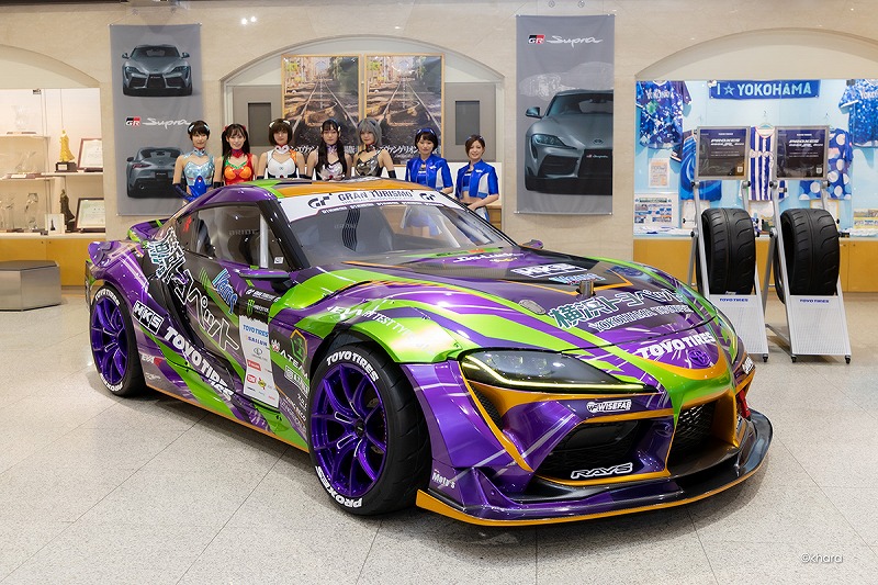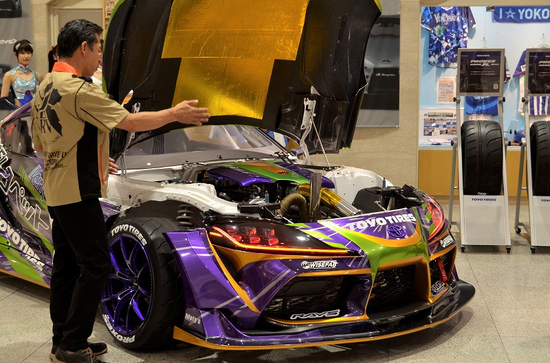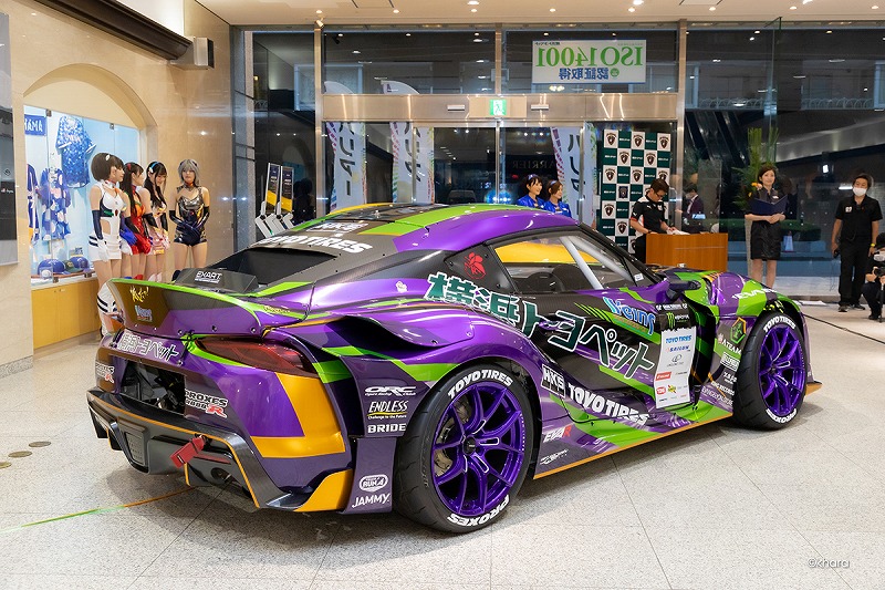 会場でアンベールされた参戦車両は、GRスープラをベースとして人気アニメ「エヴァンゲリオン」のキャラクターをモチーフにした紫色と緑色のカラーリングが施されると共に、エンジンをはじめボディの軽量化やリヤサスペンション等、ドリフト競技用にチューニングが施された。