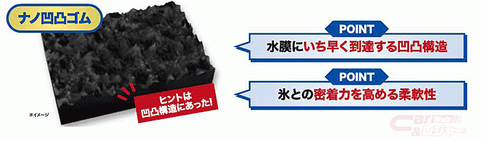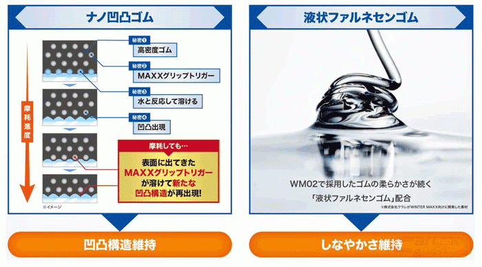 今回発売する「WINTER MAXX 03」は、「ナノ凹凸ゴム」の凹凸構造の微細な突起部分がいち早く水膜に到達することで除水スピードが速まり、密着時間が増加するとともに素材の柔らかさにより氷への密着を高めることで、新品時の氷上ブレーキ性能が22%向上、氷上コーナリング性能も11%向上した。また、摩耗しても凹凸構造を維持し続ける「ナノ凹凸ゴム」と、株式会社クラレが「WINTER MAXX」向けに開発した、ゴムのしなやかさを長期にわたって保つ「液状ファルネセンゴム」を組み合わせることで、高い氷上性能を長期間維持することが可能となったと説明している。