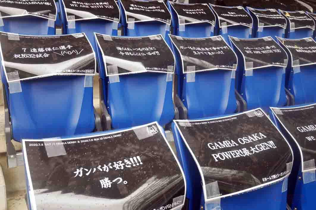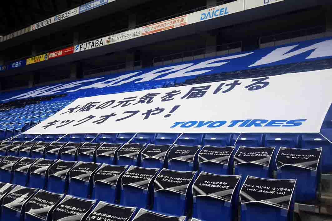 再開初戦、地元クラブ対決である“大阪ダービー”は、無観客の試合となったが“本当の意味で無観客にしないために”選手、サポーターが一体になれるよう、会場のバックスタンドにはビッグフラックとコレオグラフィー(人文字)が掲出された。また、スタンドではコーナーフラッグ四隅に「TOYO TIRES」のブルーバルーンが設置された。