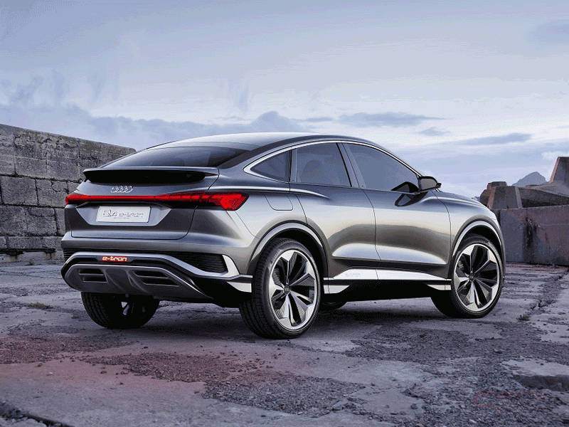 「Q4 Sportback e-tron」のエクステリアは、ルーフラインは大きく傾斜したDピラーへと流れこみ、リヤリップスポイラーへと伸びていることで全長を長く見せている。また、「 Q4 e-tron concept」のエレメントを反映した左右のリヤランプ間を結ぶ印象的な幅広いライトバンドや、複数のLEDセグメントに分割されたテールライトなど、両モデルのデザインは様々な面で共通点を備えており、水平バーを備えたバンパーディフューザーユニットの印象的なデザイン及び中央に設置された照明付きe-tronロゴは、2つのQ4バージョンに共通するエレメントとなっている。