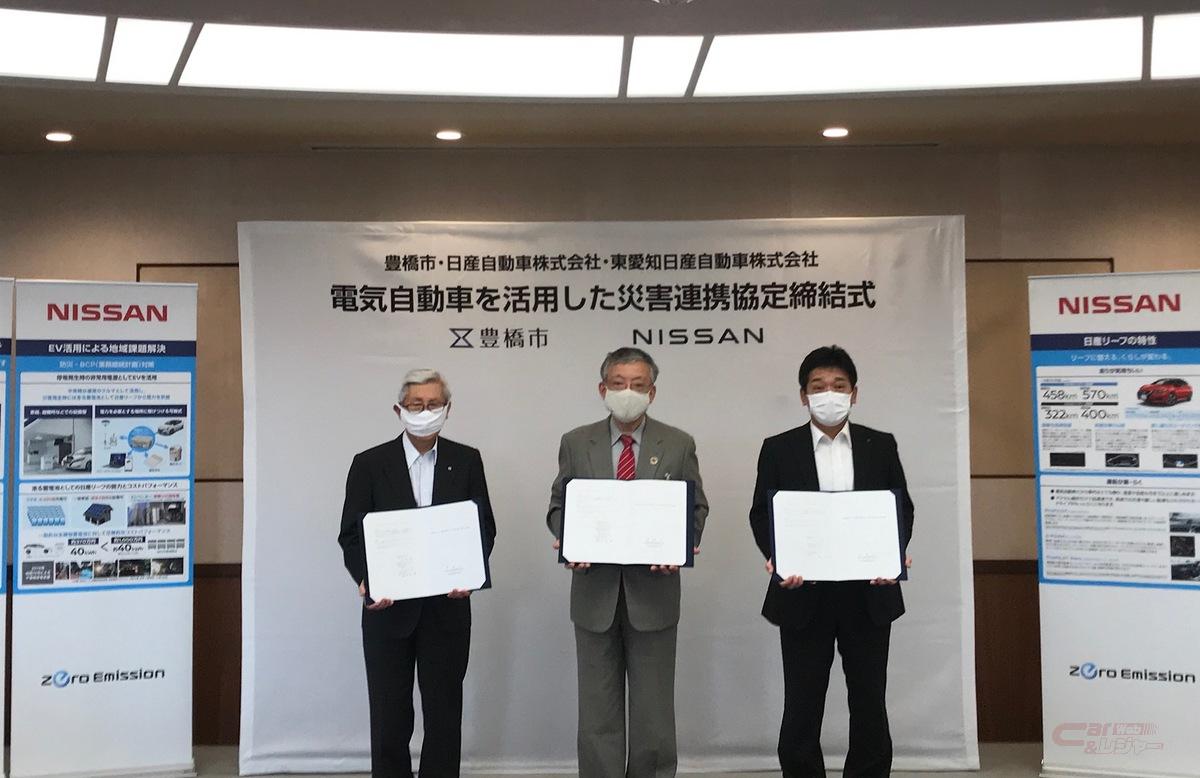 日産自動車と愛知県豊橋市、東愛知日産自動車の3者は7月28日、電気自動車を活用した「災害連携協定」を締結したことを公表した。