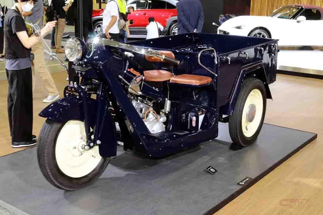 100周年にあたるマツダは、3輪トラックGA型(1938年)やR360クーペ(1960年)、初代ルーチェ(1966年)、コスモスポーツ(1967年)、サバンナRX-7(1978年)等歴代の名車9台を展示。さらに、100周年特別記念車、今秋国内導入が発表されたMX-30等も参考出品された。