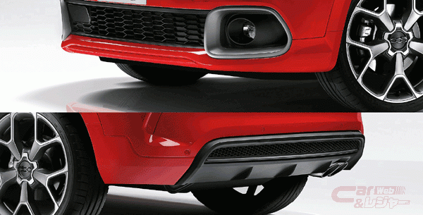 今回追加される「500X Sport」は、大開口のロアインテークを持つスポーツフロントバンパー、ボディ同色サイドスカート、スポーツリアバンパーといった専用エクステリアを装備し、随所にダークグレーのアクセントカラーを施しているほか、19インチ10スポークタイプのアルミホイールやボディ同色ホイールアーチモールディングの採用により低重心感が強調されている。
