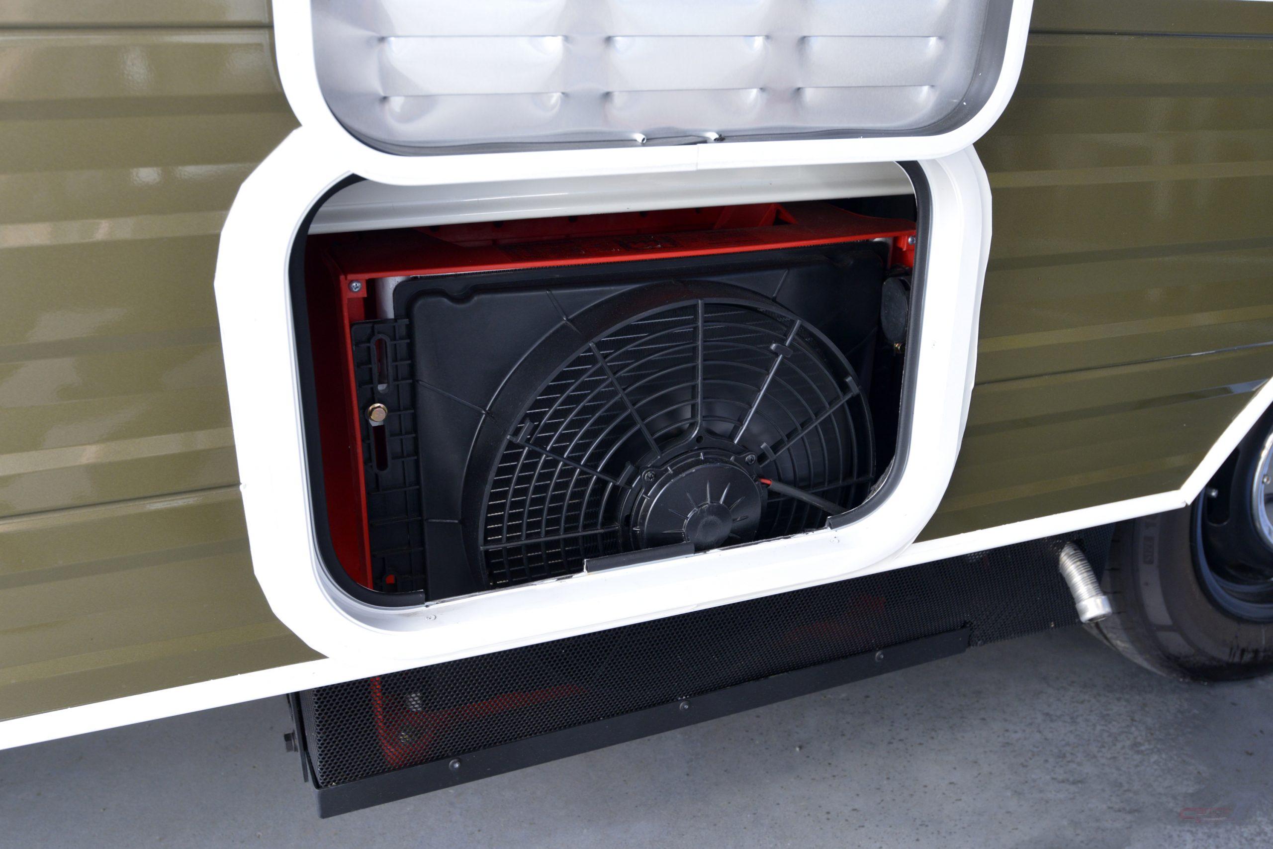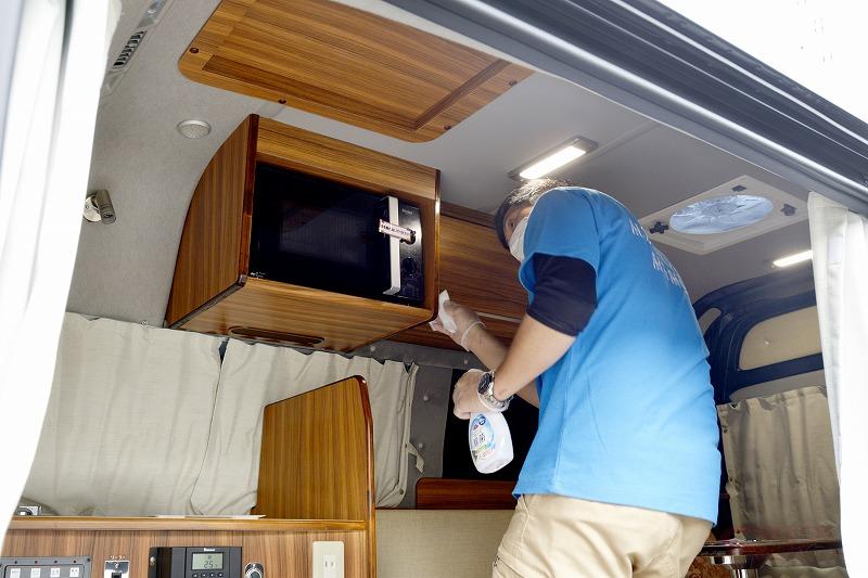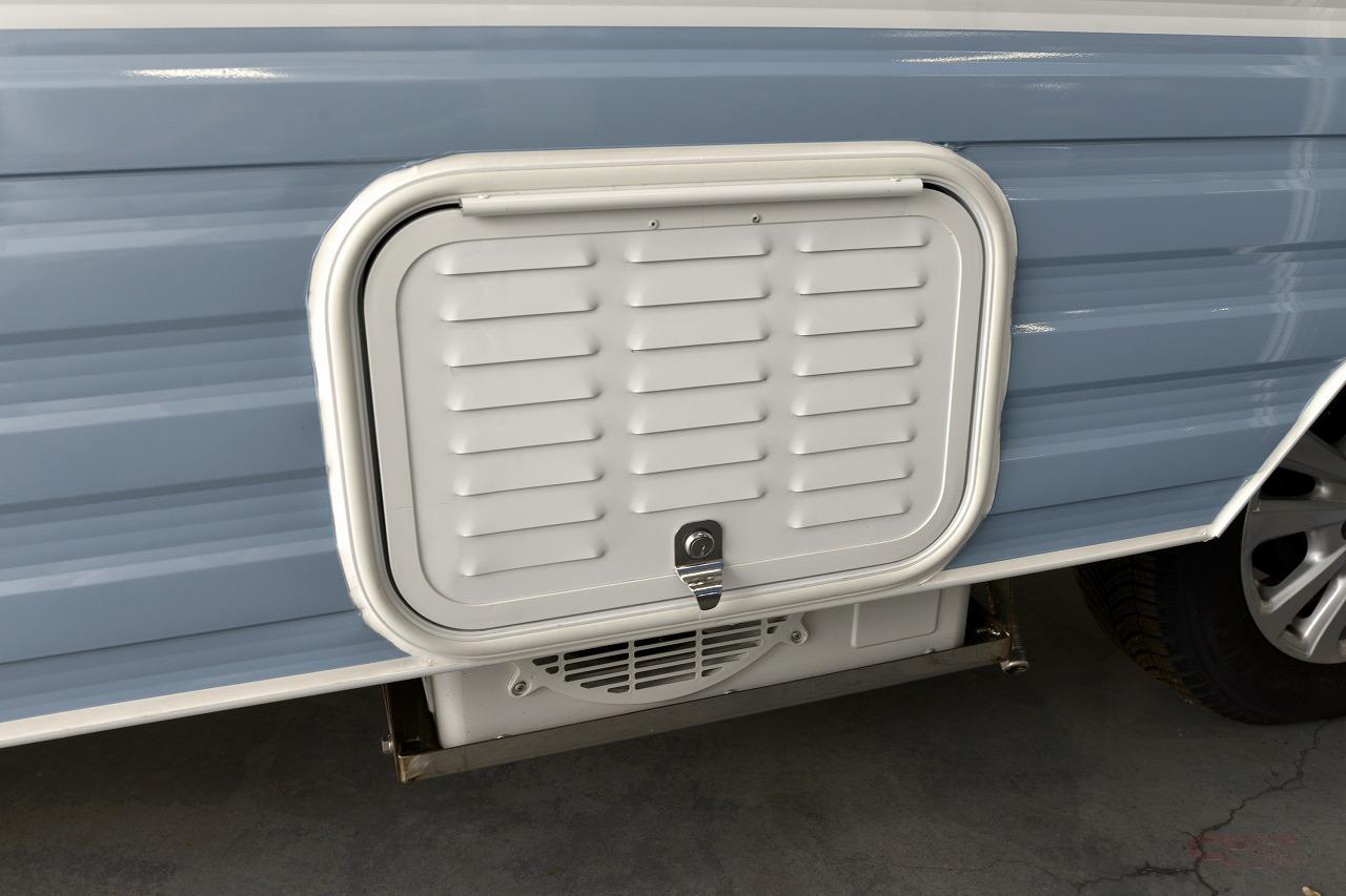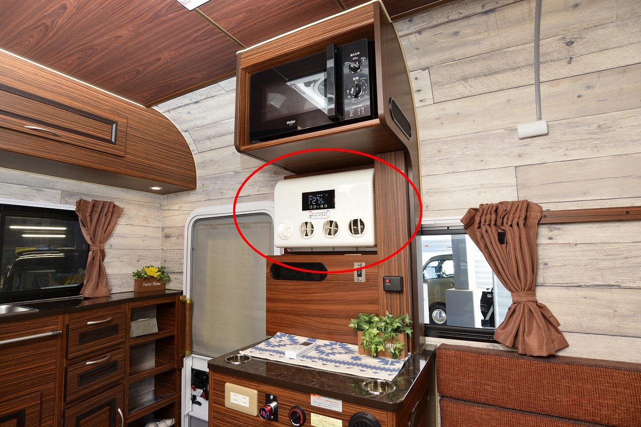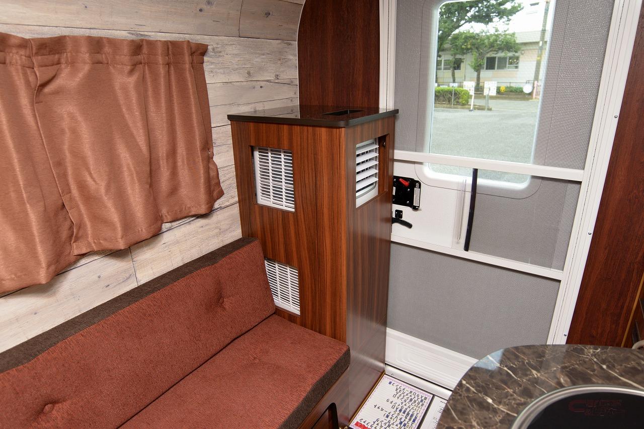 クーラーの種類も豊富で家庭用エアコンをはじめ、12V電源で利用できるクーラーや縦型のスポットクーラー等を用意。モデルに応じて搭載するクーラーは異なるが、室内全体の統一感を失わない自然な配置に加えて、ボディサイドやリヤに設置された室外機もすっきりと収まり職人の高い技術力が発揮されていた。