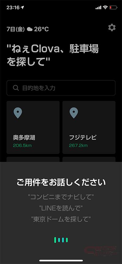 LINEのAIアシスタントClova(クローバ)を利用し、「ねえクローバ、○○へ行きたい」と話かけることで目的地の候補が複数表示され、さらに行きたい候補の番号を伝えるとナビが開始する。これがLINEカーナビの最大の強みである。