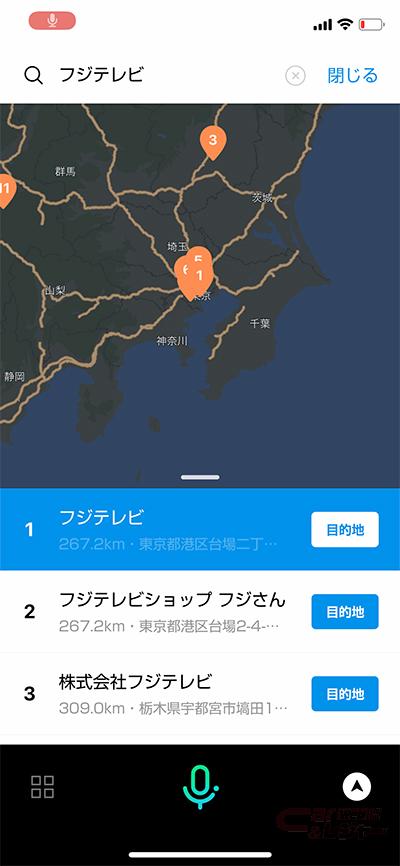 LINEカーナビは今回唯一、音声だけで「目的地検索→行き先選択→ナビ案内開始」まで完結することが可能なアプリである。Google MapsやYahoo!カーナビは、音声入力で目的地の検索は可能だが、案内開始までのすべてを完結させることはできない。