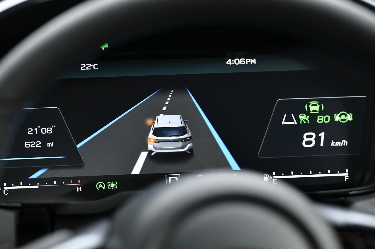 スバル車初搭載のアイサイトXは、広角化した新開発のステレオカメラ、前側方レーダー、電動ブレーキブースターを標準装備し、後側方レーダー、リヤソナーと合わせ、360度センシングを実現。自車右折時の対向車両、自車右左折時の歩行者、自車に向かって横断してくる自転車の衝突回避機能を同社で初めて実装している。さらに、ブレーキ制御だけでは衝突回避が困難な場合、システムの操舵制御で衝突回避支援、前側方からの接近車両の衝突回避機能なども備えている。
