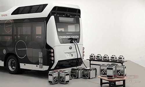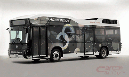 トヨタの燃料電池バス「CHARGING STATION」は、従来型の「トヨタFCバス」をベースに、高圧水素タンクの本数を倍増させて水素搭載量を大幅に増やすことにより、高出力かつ大容量の発電能力(最高出力18kW、発電量454kWh)を備えており、災害などによる停電時には「Power Exporter 9000」を介して発電した電気を可搬型の大容量バッテリー「Honda Mobile Power Pack」や「LiB-AID E500」に貯めることで、避難所などの屋内や車内などで電気が使用可能となる。さらに「CHARGING STATION」には車内に仮眠が取れるスペースを作っており、災害発生時には休憩の場所としても活用することができる。