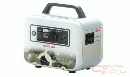 移動式発電・給電システム「Moving e」は、トヨタの燃料電池バス「CHARGING STATION(チャージングステーション)」とHondaの可搬型外部給電器「Power Exporter(パワーエクスポーター)9000」、可搬型バッテリー「LiB-AID(リベイド)E500」・「Honda Mobile Power Pack(モバイルパワーパック)」、モバイルパワーパックの充電・給電器「Honda Mobile Power Pack Charge & Supply Concept(チャージアンドサプライ コンセプト)」で構成され、「CHARGING STATION」にすべての機材を積み込んで必要な場所へ移動して電気を供給する。具体的には燃料電池バスを電源とし、可搬型外部給電器・可搬型バッテリーを用いてバスから電気を取り出し、電気製品に電気を供給する。