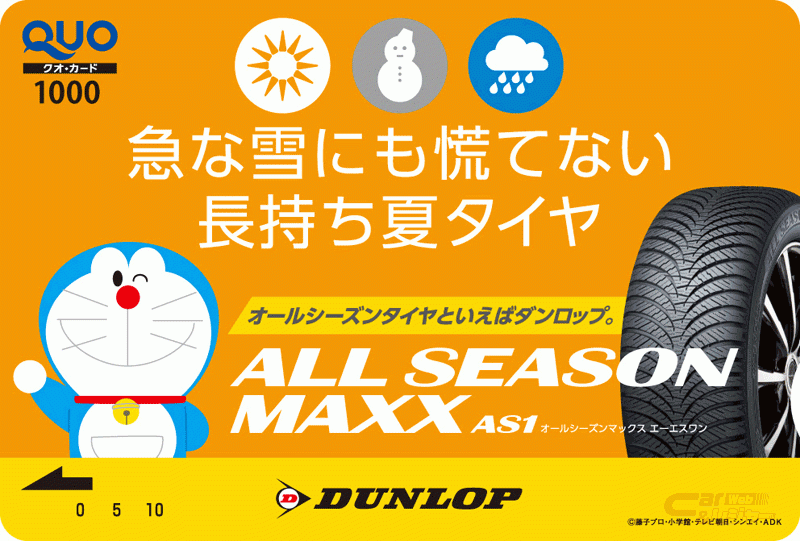 上記キャンペーンは9月4日(金)~10月4日(日)の間、誰でもTwitterから応募が可能で、抽選で100名にオリジナルのドラえもんQUOカードをプレゼントする。さらにWチャンスとして当選者100名の中から3名に「ALL SEASON MAXX AS1」が当選する。