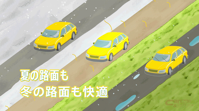 好きな季節にダイヤルをセットすると、まわりの季節をたちまち変えることができるひみつ道具「オールシーズン・バッジ」を使って、暑い夏の日にみんなを涼しくしてあげようと冬に変えるドラえもん。走行中の車の周囲には雪が降り始め、運転が少し不安になるが、その中でも快適な走りを見せる「ALL SEASON MAXX AS1」。急な雪にも慌てることなく安全かつ安心に走行できる「オールシーズンタイヤ」の特徴を分かりやすく紹介する。