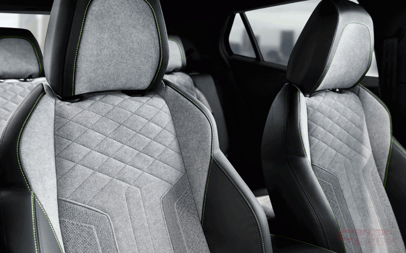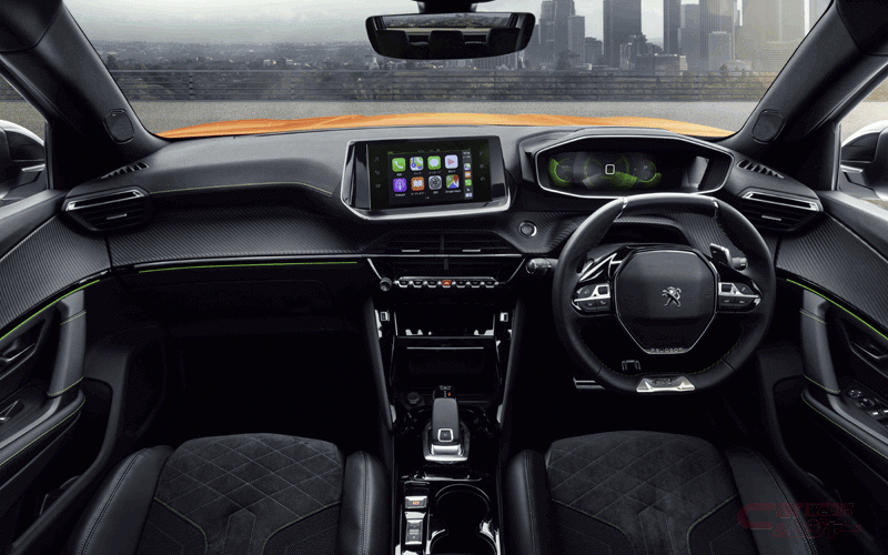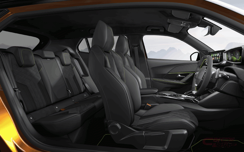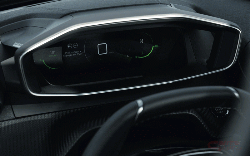 インテリアでは、PEUGEOT i-Cockpit®の新世代バージョンである3D i-Cockpit®を採用。小径ステアリングホイールを採用することで、ステアリングの上からメーターを確認することによる視線の確保、肘が下がり脇を締めたコンパクトなドライビングポジションによるステアリング操作の少ない動線などを実現している。また、ホログラムのように情報を立体視で映し出すデジタルヘッドアップインストルメントパネルは、ドライバーにとって必要な情報を重要度に応じてレイヤー化表示したもので、運転時のドライバーの情報に対する反応性が約0.5秒向上(プジョー調べ)するという。