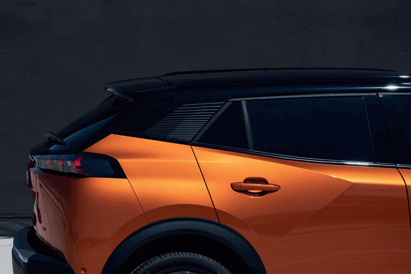 サイドビューは、全高は国内の立体駐車場に収まる1550mm、最低地上高は205mmと高めにとり、ブラックダイヤモンドルーフ&ブラックドアミラー&ブラックウインドウストリップ(GT Line)、ブラックアウトしたCピラーによる視覚的相乗効果とセグメント最長クラスとなる2,610mmのホイールベースによりのびやかで流れるようなデザインを採用。17インチ大径ホイールを装備し、「SUV e-2008」の18インチホイールにはインサートが追加され、カスタマイズのしやすさ、大幅な軽量化(全ホイールで約4kg)、エアロダイナミクスの向上を実現している。