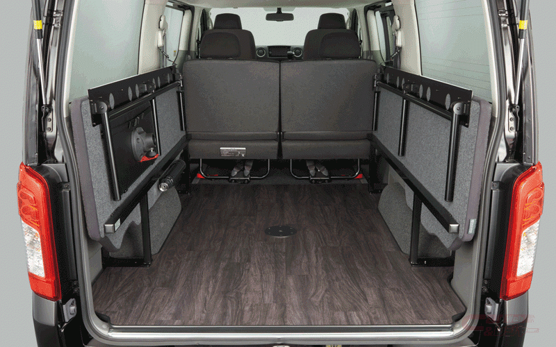 NV350キャラバン「マルチベッド」は、荷室スペースに左右跳ね上げ式のベッドシステムと硬質のフロアパネルを装備することにより、車内での快適な休憩や宿泊のための機能を有しながら、積載性も兼ね備えたモデル。ベッドは荷室全面にわたって展開できるほか、左右に独立させた状態での使用も可能となっている。さらに、ベッドをベンチとしてオプションのテーブルと組み合わせて使用することもでき、使用シーンに合わせてさまざまなアレンジが可能となっている。