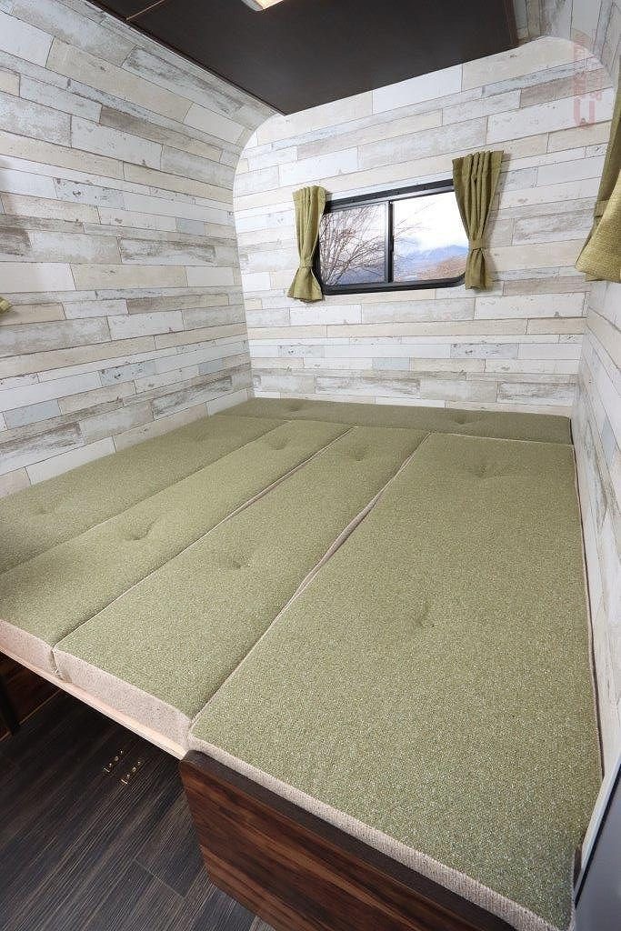 インテリアはレジストロシリーズの特徴であり評判のウッドテイストの壁面を採用。シートレイアウトは、コの字型とチャイルドシートが装着可能な前向きシートの2タイプを設定している。どちらのタイプもフロア全面をフルフラットベッドへ展開可能。このダイネットベッドは1850mm(奥行)×1250mm(横幅)の広さで、バンクベッド(同1800mm×1770mm)と合わせて5名の就寝が可能だ。