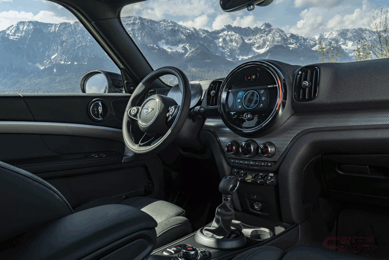 インテリアにおいては、シフト・バイ・ワイヤ機構を取り入れた電子制御式8速オートマチック・トランスミッションを全車に標準装備(MINI Cooper S E Crossoverを除く)するとともに、視認性に優れ様々な情報を表示可能なマルチ・ディスプレイ・メーターパネルの採用により、インテリアの印象も一新した。センター・ディスプレイは、従来のタッチ操作可能に加え、操作ボタンをフラットにすることで、シンプルかつモダンなデザインへ変更したほか、個性を際立たせるオプション装備MINI Yours(ユアーズ)インテリア・スタイルに、繊細なライトニングが上質な車内空間を演出するシェーデッド・シルバー・イルミネー・テッドが新たに追加となっている。