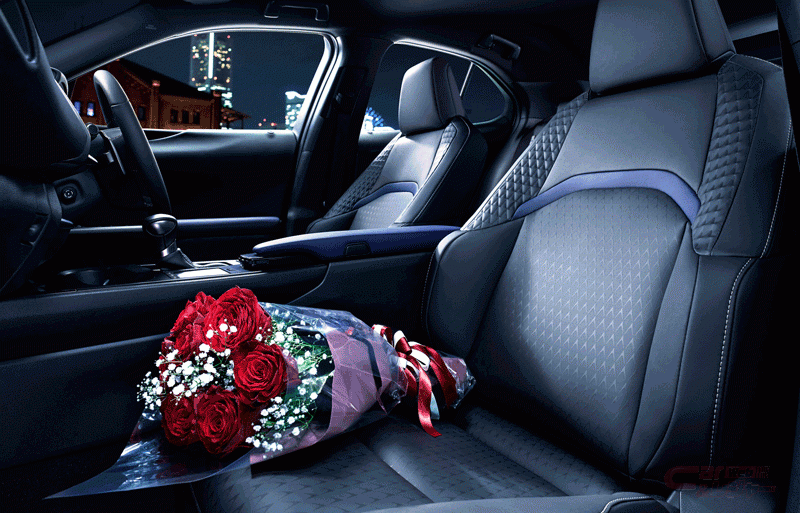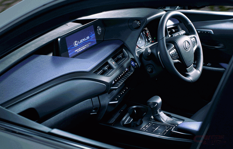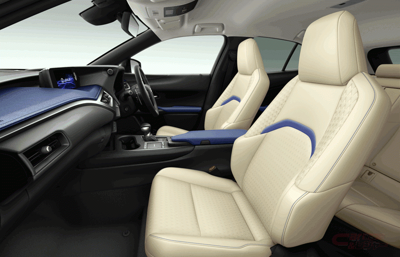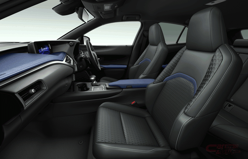 特別仕様車“Urban Elegance”は、UX250h “version C”/UX200 “version C”をベースとして、専用内装色としてリッチクリーム&ブルーとブラック&ブルーの2種類を設定したほか、アームレストやドアトリムにはブルーのアクセントカラーを施している。エクステリアにおいては、スピンドルグリル、ヘッドランプ、ドアミラー、ルーフレール、ホイールにブラック塗装を施した。