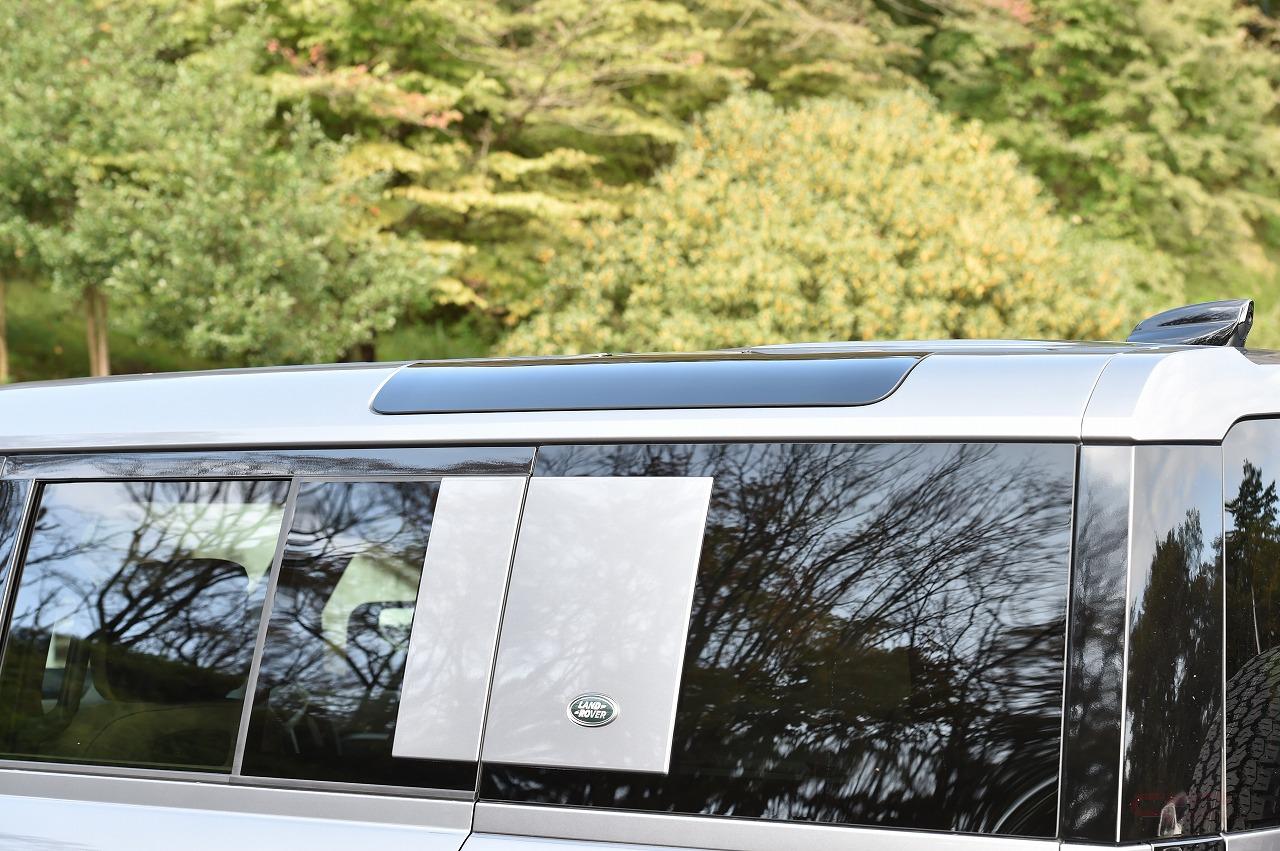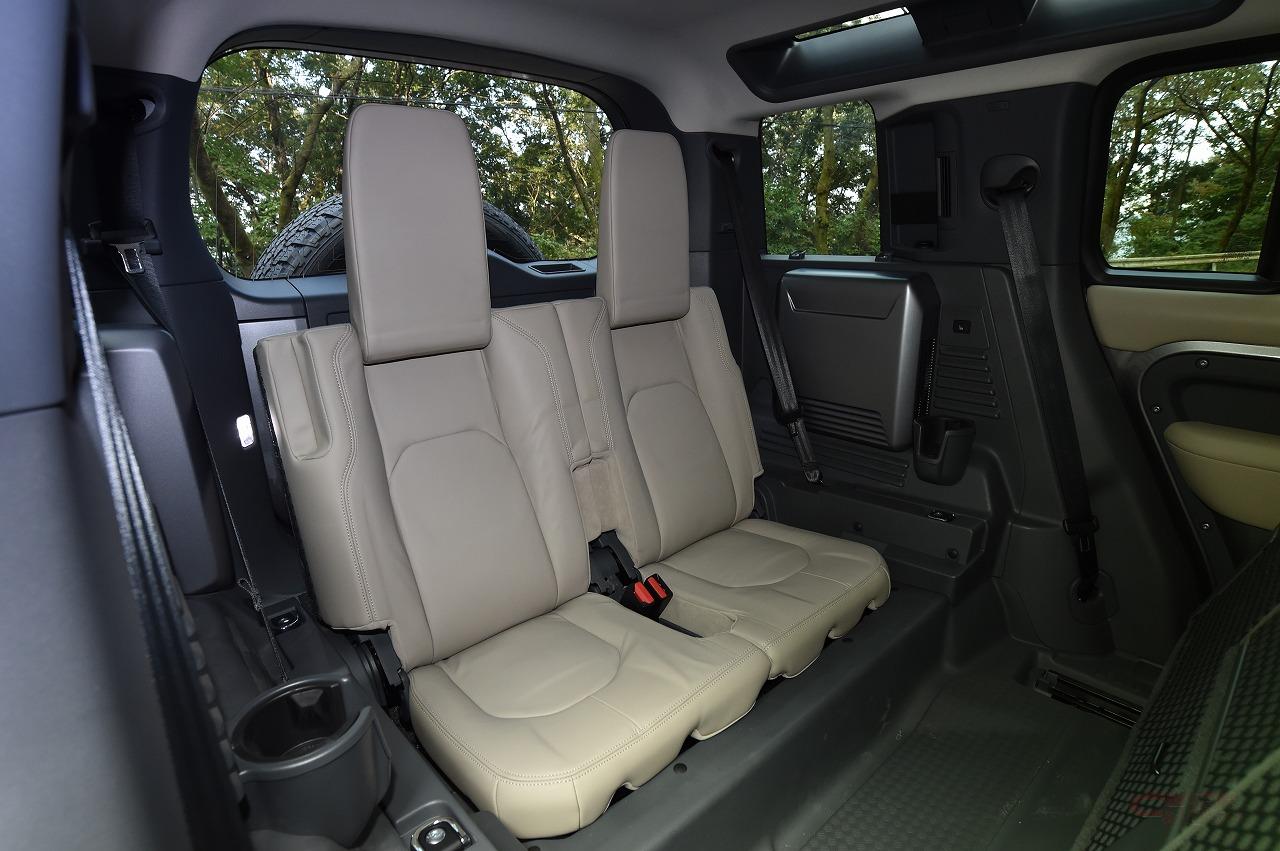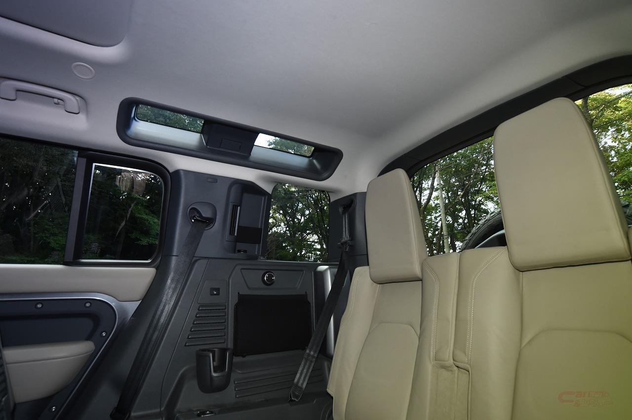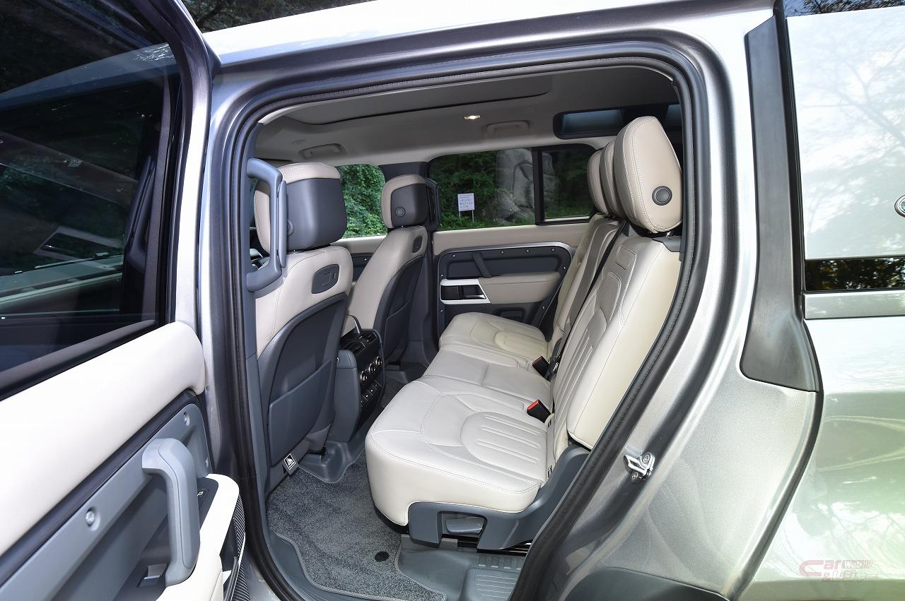 また、110にはオプションで3列目シートを装備でき、試乗車にも設定されていたが、こちらは大人が長時間座って移動するには狭く、あくまでも非常用と割り切った使い方が求められる。とは言え、3列目にもエアコンの送風口やUSBポートが設けられ、アルパインライトによって外からの視界も確保されており、3列目の居住性や快適性は疎かにはされていない。