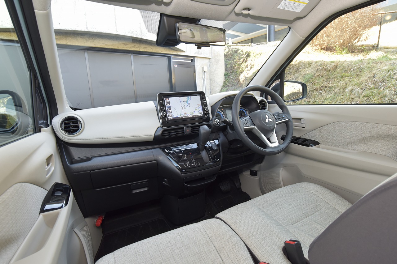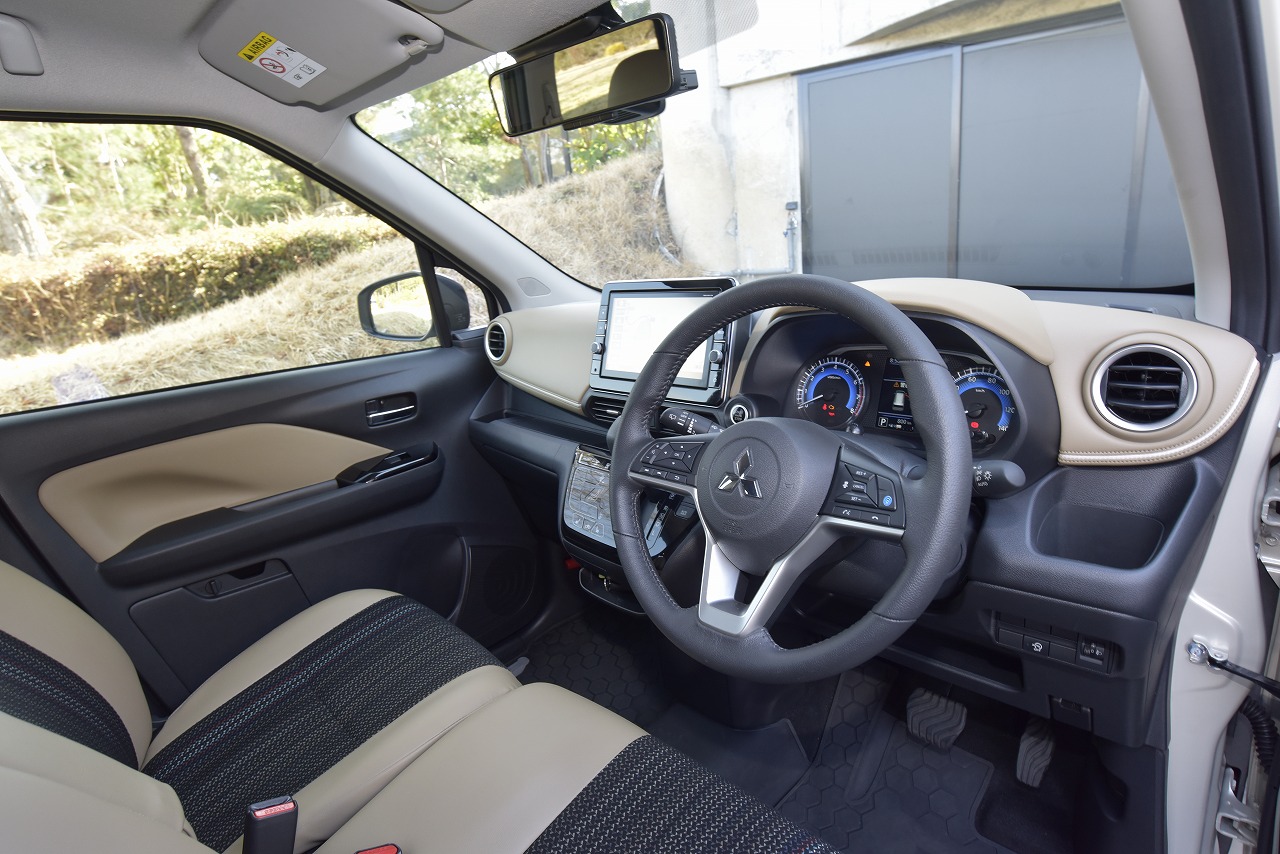 インテリアカラーは、ekワゴンはライトグレー、ekクロスはブラック基調でそれぞれのキャラクターを表現。またekクロスにはオプションで「プレミアムインテリアパッケージ」も設定されており、ブラックとタンのコンビネーションにアイボリー系のアクセントを加え、遊び心のある空間が演出されている。