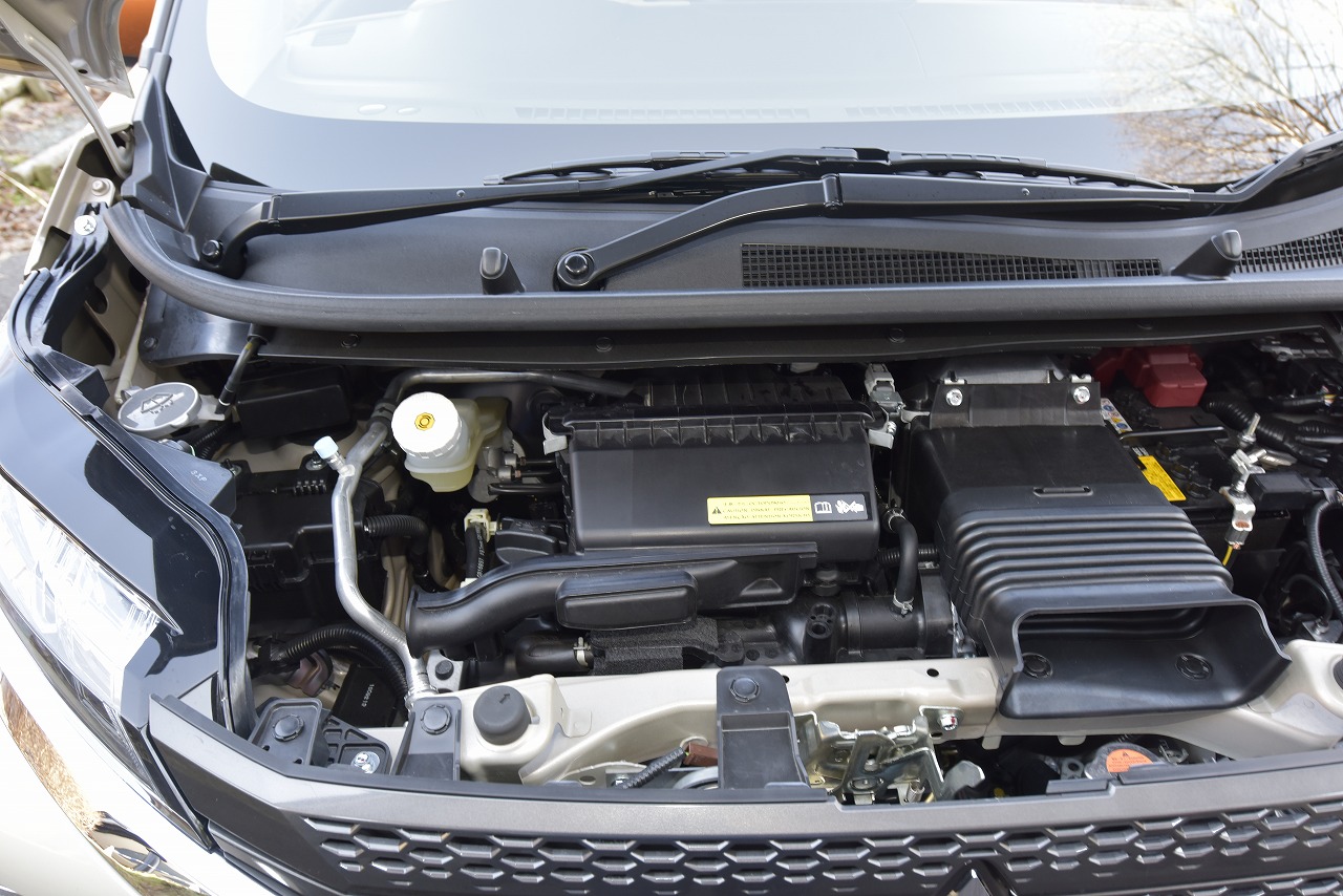 またekクロスに搭載されるハイブリッドシステムは、最高出力2.7psの小型モーターを採用。EV走行モードはなく、加速時にモーターがアシストするいわゆるマイルドハイブリッドだが、加速中に作動条件を満たすと最大30秒間モーターが駆動力をアシストすることで、燃費向上と力強く滑らかな走りを実現するとしている。駆動用バッテリーはリチウムイオンで、運転席シート下に収められている。