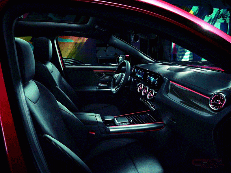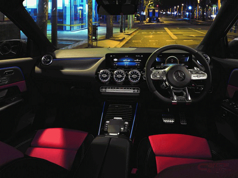 インテリアにおいては、コックピットディスプレイでは「スーパースポーツ」を含むAMG専用の表示スタイルから選択可能としているほか、フラットボトム型となるナッパレザー/DINAMICAの「AMG パフォーマンスステアリング」を装着。ステアリングホイールには、手を離さずに走行モードを変更することができる「AMGドライブコントロールスイッチ」が装備され、右側のスポークの根元に位置するボタンはAMG DYNAMIC SELECTの走行モードなどを選択することができ、例えばマニュアルモード、ESP®などの設定を行うことができる。標準のフロントシートは、ヘッドレストとバックレストが一体化したセミバケットタイプのスポーティなデザインとなっており、さらにAMGパフォーマンスパッケージを選択することでサイドサポートが高く、メルセデスAMGのトップモデルに採用される「AMGパフォーマンスシート」が装備される。