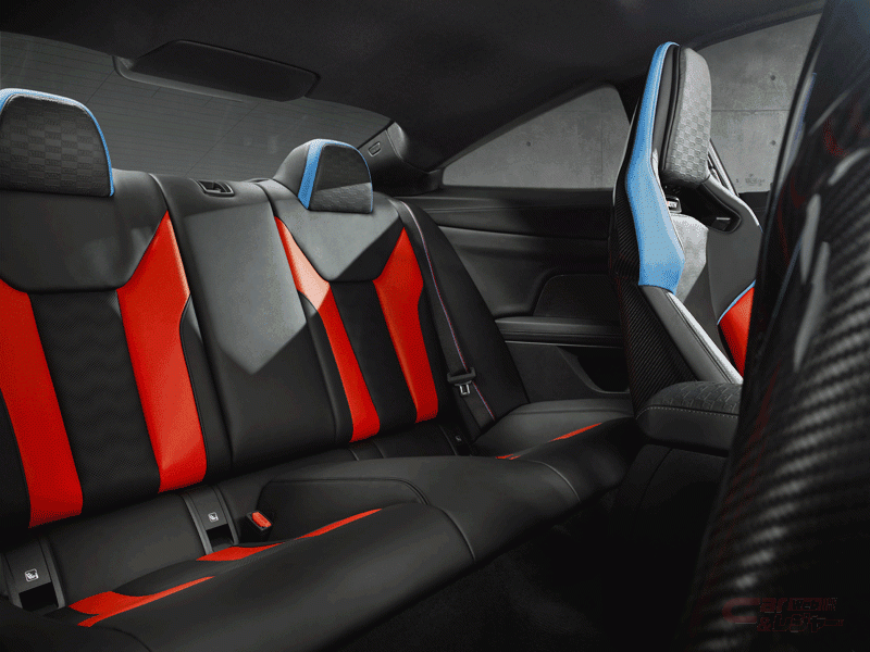 インテリアにおいては、3色のMカーボン・バケット・シートが採用され、ブラックのフル・レザー・メリノには、BMW Mカラーのライト・ブルーとレッドのディテールが鮮やかなアクセントとなっている。ファイグ氏のE30 M3と同様に、M4 Competition x KITHの前席および後席のヘッドレストとセンター・アーム・レストに採用されているブラックのレザーにはKITHロゴが刻印されている。センター・コンソールには、KithロゴとBMW Mストライプがあしらわれた専用のエンブレムが配置され、前席ヘッドレスト下方の照明付きMバッジにも、同様にKithロゴが施されている。