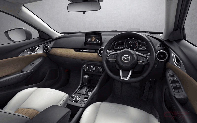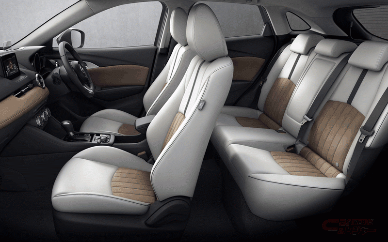「CX-3」特別仕様車「Urban Dresser」は、シートに革のような風合いと手入れのしやすさを両立した明るいピュアホワイトの人工皮革を採用、シート中央やダッシュボード、ドアトリムには手触りの良いライトブラウンのスエード調人工皮革・グランリュクス®を使用し、カジュアルモダンな装いの室内空間を演出している。