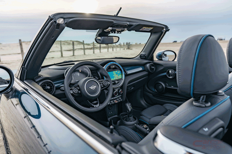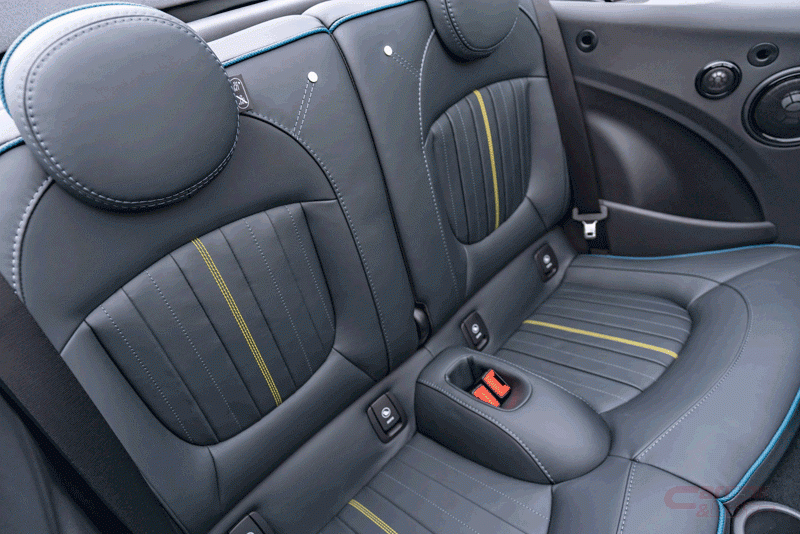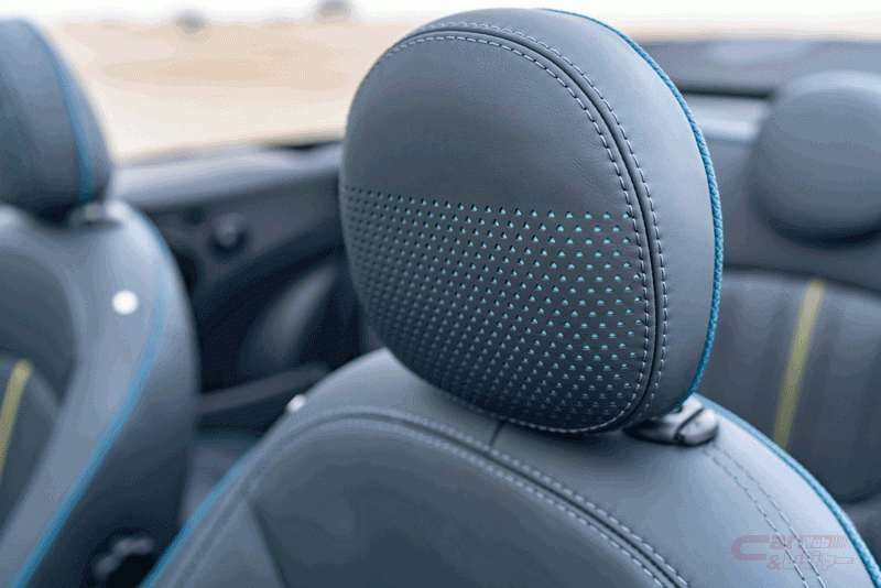 インテリアにおいては、シートにMINI Yoursレザーのラウンジ・サイドウォーク・アンスラサイトを採用し、ダーク・ペトロールのパイピングとイエローのステッチがあしらわれている。さらに、フロアマットにも、イエローのコントラスト・ステッチを採用し、ダーク・ペトロールのエッジを施すことにより、斬新かつ情熱的な限定モデルとなっている。