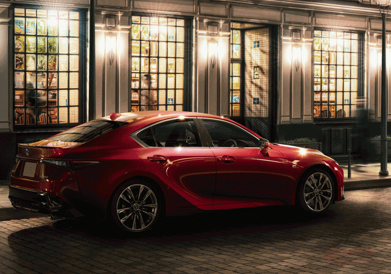 “F SPORT”は前後異サイズ19インチホイールを専用設定し、スタビライザー、EPSなどを専用チューニングしたほか、ショックアブソーバーの減衰力を最適に制御するNAVI・AI-AVSを標準装備し、状況に応じて優れた乗り心地と走行安定性を両立した。また、F SPORTおよびFモデルに採用されている専用のFメッシュデザインのスピンドルグリルを採用し、グリルロア部のエアインテーク、サイドにロッカーモールフィン、リヤスポイラーとリヤバンパーロアガーニッシュを配し、ピアノブラック塗装のカラーリングで統一することで、“F SPORT”の精悍さを表現した。さらにF SPORT専用外板色として、ラディアントレッドコントラストレイヤリングを設定した。