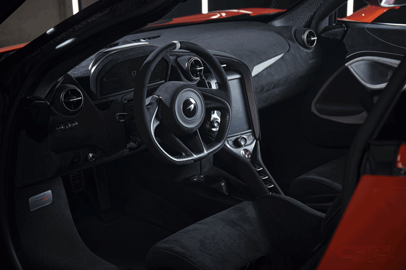 インテリアでは、全体にカーボン・ファイバーを使用することでより軽量化され、標準装備の軽量カーボン・ファイバー製シェル型レーシング・シートは、「McLaren 720S」のスポーツシートより合計で18kg軽量化されている。ビスポークの軽量センタートンネルは、カーボン複合素材で作られており、そのパネルの厚さはわずか0.8mm。カーボン・ファイバーは、ウィンドー・スイッチ周辺、ステアリング・ホイールの金具およびアクティブ・ダイナミクス・パネルでも使用されており、あらゆるアイテムで重量削減が図られている。さらなる重量削減を希望するカスタマーは、マクラーレン・スペシャル・オペレーションズが開発した、MSO Definedのシリーズからカーボン・ファイバーオプションを注文することも可能。