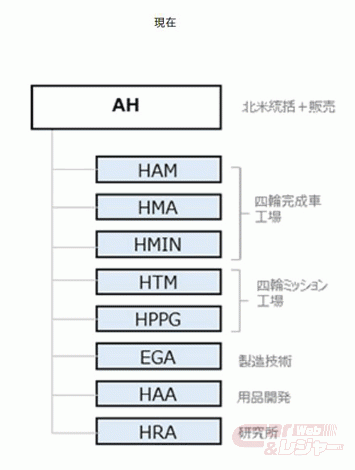 ※HRAのうちオハイオの四輪開発機能はHDMAへ、カリフォルニアのデザインセンターはAHへ移管