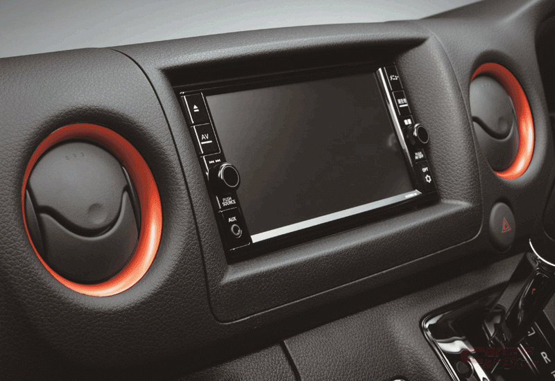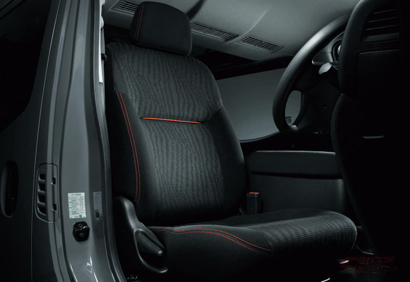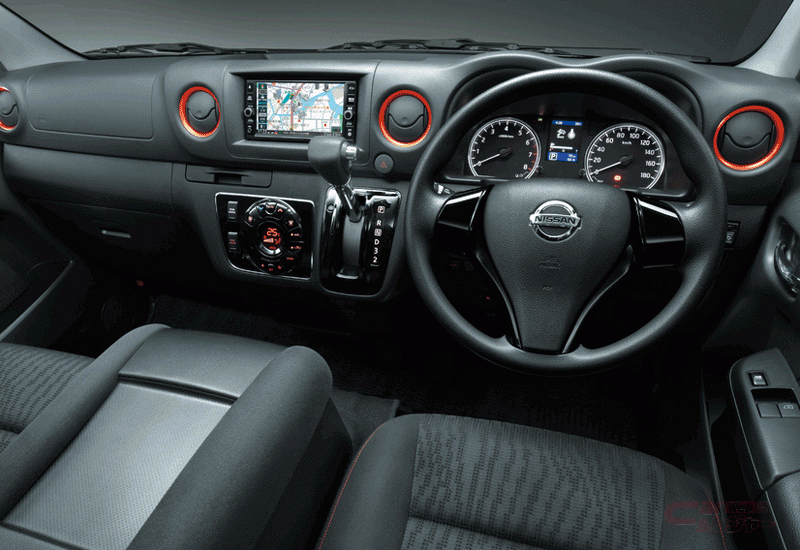 インテリアは、「NV350キャラバン」初となるブラックを基調としており、ピアノブラック調加飾付ステアリングや、ピアノブラック調インストシフトフィニッシャーをはじめ、インストロア、グローブボックス、ドアトリム、フロアマットなどもブラックで統一した。エクステリア同様に、エアコンの吹き出し口周りや、運転席と助手席のシートに施されたダブルステッチに、オレンジの差し色を加えてアクセントとしている。