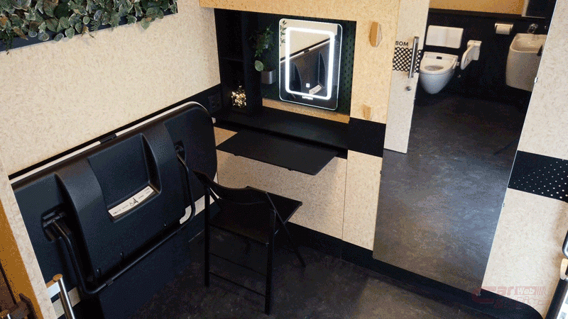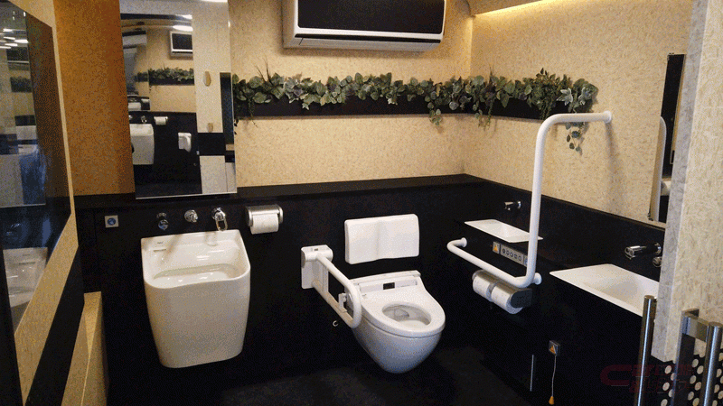 開発にあたっては、パラアスリートや福祉工学の専門家、被災経験のある自治体関係者、さまざまな理由で車いすを使用することになった人々にヒアリングを実施。車両の前後方には遠くから認識できるよう大きな多機能トイレマークを配置し、超低床車体の設計によって、出入口への動線はなだらかなスロープを実現している。車内は車いすが回転しやすい空間を確保し、手すりの備わった大便器など車いす使用者にとって必要な機能を兼ね備えている。また、多目的に使えるユニバーサルシート(大型ベッド)や車いす使用者がより快適にトイレを利用するために、自分で衣服を整えたり介助者が待機できる前室を用意している。