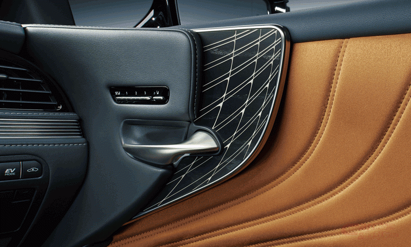 レクサスのデザイン思想にある、時の移ろいや環境の変化の中で、その時々の美しさを感じられる日本ならではの美意識を表した考え方「Time in Design」を追求。新型LSでは、「月の道」という自然界の神秘的な情景をモチーフに、内外装をコーディネートした。