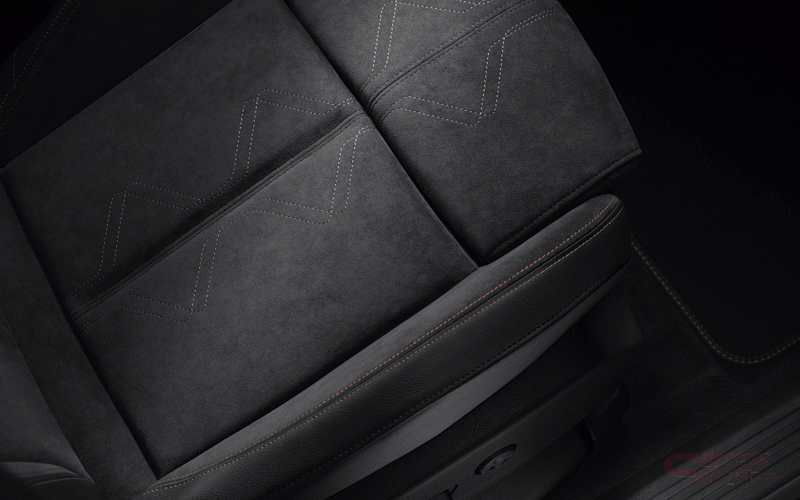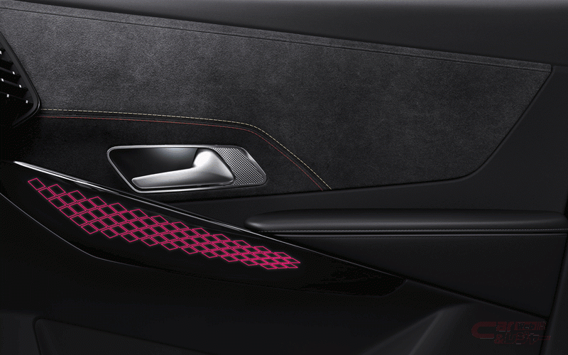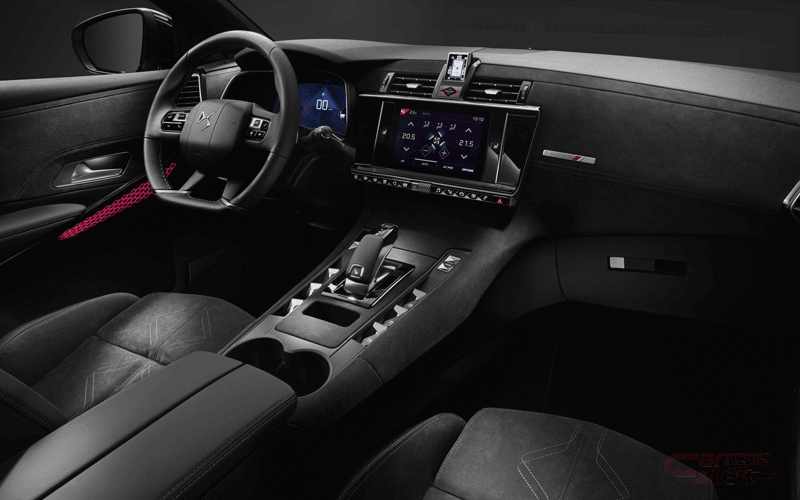 「DS 7 CROSSBACK」ならではの華やかさを生み出すクロームパーツをあえて排し、ストイックにブラックを基調としたスタイルを採用。Grand Chicインスピレーションでは、アートフィニッシュレザー(ムラ染)で覆われたダッシュボード、センターコンソール、ドアトリムがアルカンタラ®仕上げとなっており、カルマン(カーマインレッド)とゴールドのステッチがアクセントとしてあしらわれている。アルカンタラ®のテクスチャー、DSならではのオリジナリティ溢れるダイヤモンドパターンのアルカンタラ®のシートステッチ、スポーティなパーフォレーテッド加工Dシェイプステアリングホイールといったディテールが、これまでにないエレガンスとスポーティの融合を演出している。