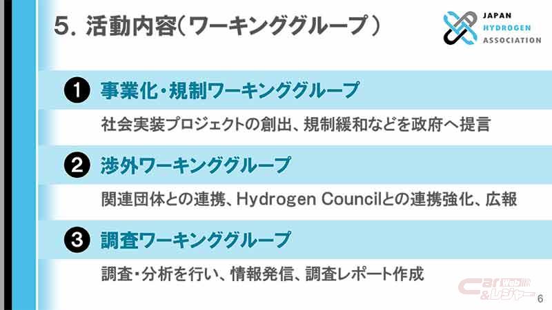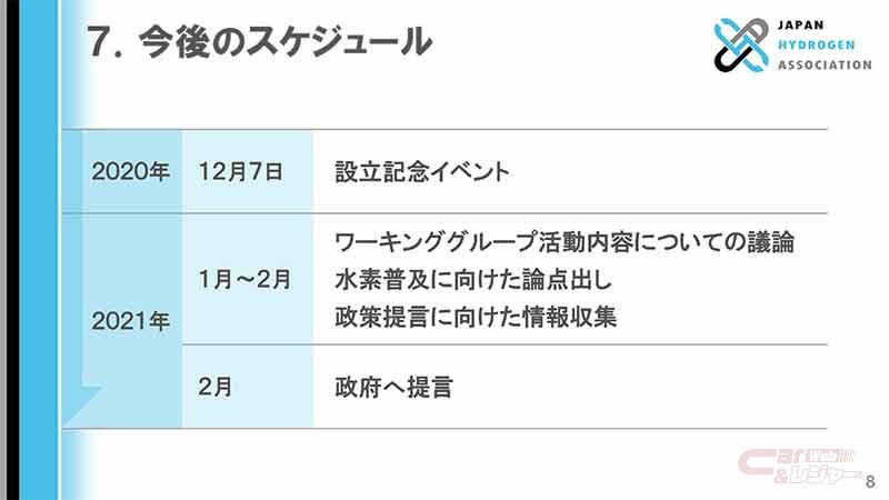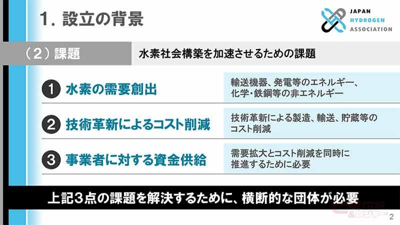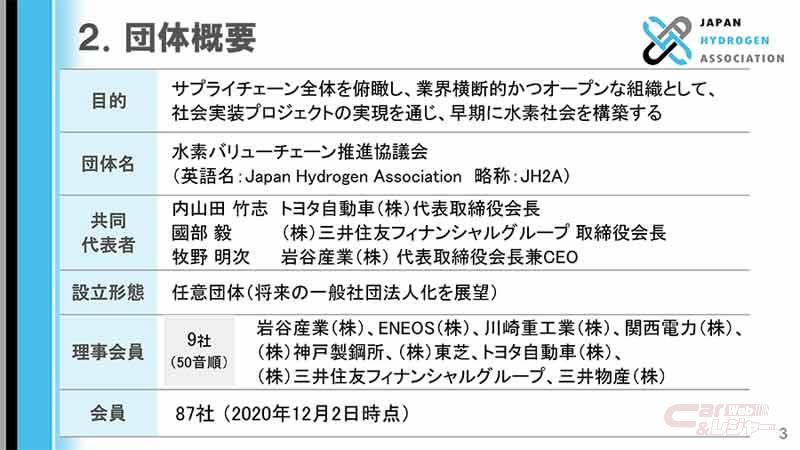トヨタは、CO2排出量削減による地球温暖化抑制に貢献するための様々な取り組みの一環として、JH2Aが掲げる「早期に水素社会を構築する」という目的の実現に向け、JH2Aのステークホルダーとともに積極的に取り組んでいくと述べている。