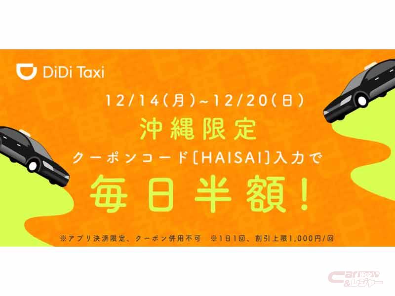 DiDiモビリティジャパンは12月9日、「沖縄限定 タクシーが毎日半額」キャンペーンを12月14日(月)~12月20日(日)の7日間開催すると発表した。同キャンペーンでは、期間中にクーポンコード「HAISAI」を入力してアプリ決済すると、乗車料金が半額(1日1回まで、割引上限1,000円/回)となる。