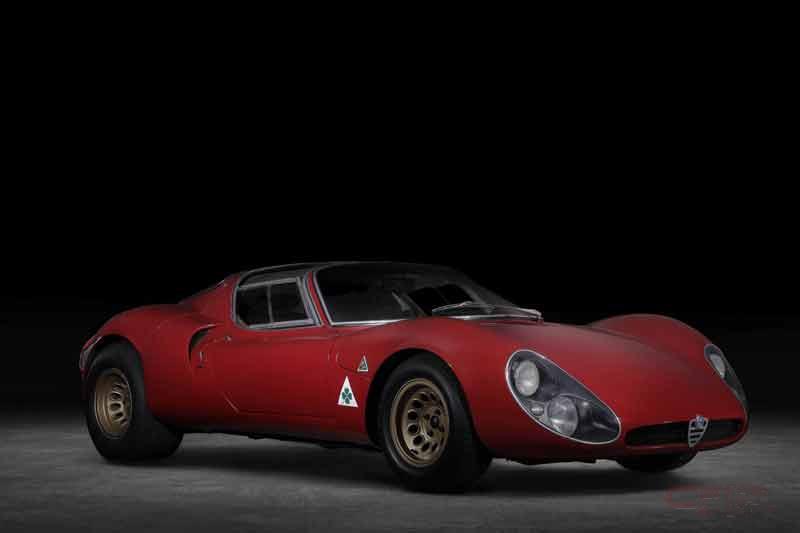 1967 33 Stradaleは、1967年のイタリアF1グランプリ前夜祭が開催された1967年8月31日にモンツァ・サーキットでデビューした、アルファロメオのアイコンモデル。「Stradale」というイタリア語は「ロードゴーイング」を意味し、最高速度は162mph(約260km/h)をマークした。33 Stradaleは、1968年のデイトナ24時間レースでクラス優勝したTipo 33レーシングカーをベースに、フランコ・スカリオーネがデザインしたハンドビルドのエキゾチックなミッドシップエンジン・スポーツカーで、今日に至るまで、最先端のテクノロジー、レーシング・テクノロジー、インスピレーション溢れるデザインを融合したクルマとしてファンの熱狂的な支持を得ている。製造された車両はわずか18台で、完成車のほとんどはアルファロメオを象徴するレッドで塗装され、グレーゴールドのホイールとブラック/タバコのインテリアを備えている。