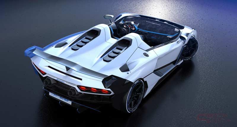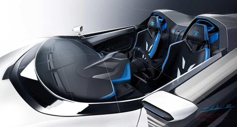 カーボンファイバー製ボディは、ランボルギーニのエアロダイナミクス・エンジニアが手作業で磨き上げ、マシンの性能とコックピットに座るドライバーのどちらにとっても最適なエアフローを実現。オープンカーでありながら高速走行でも快適なドライビングが可能となっている。特徴的なフロントスプリッターは2枚のフィンが囲み、ボンネットのエアインテークはHuracan GT3 EVOからインスパイアを受けたデザインを採用しているほか、彫刻のようなサイド部分にはEssenza SCV12で採用したソリューションが反映されており、力強いリア部分には大型のカーボンファイバー製ウィングを取り付け、ロー、ミディアム、ハイと負荷に合わせて3つのポジションに調整が可能となっている。