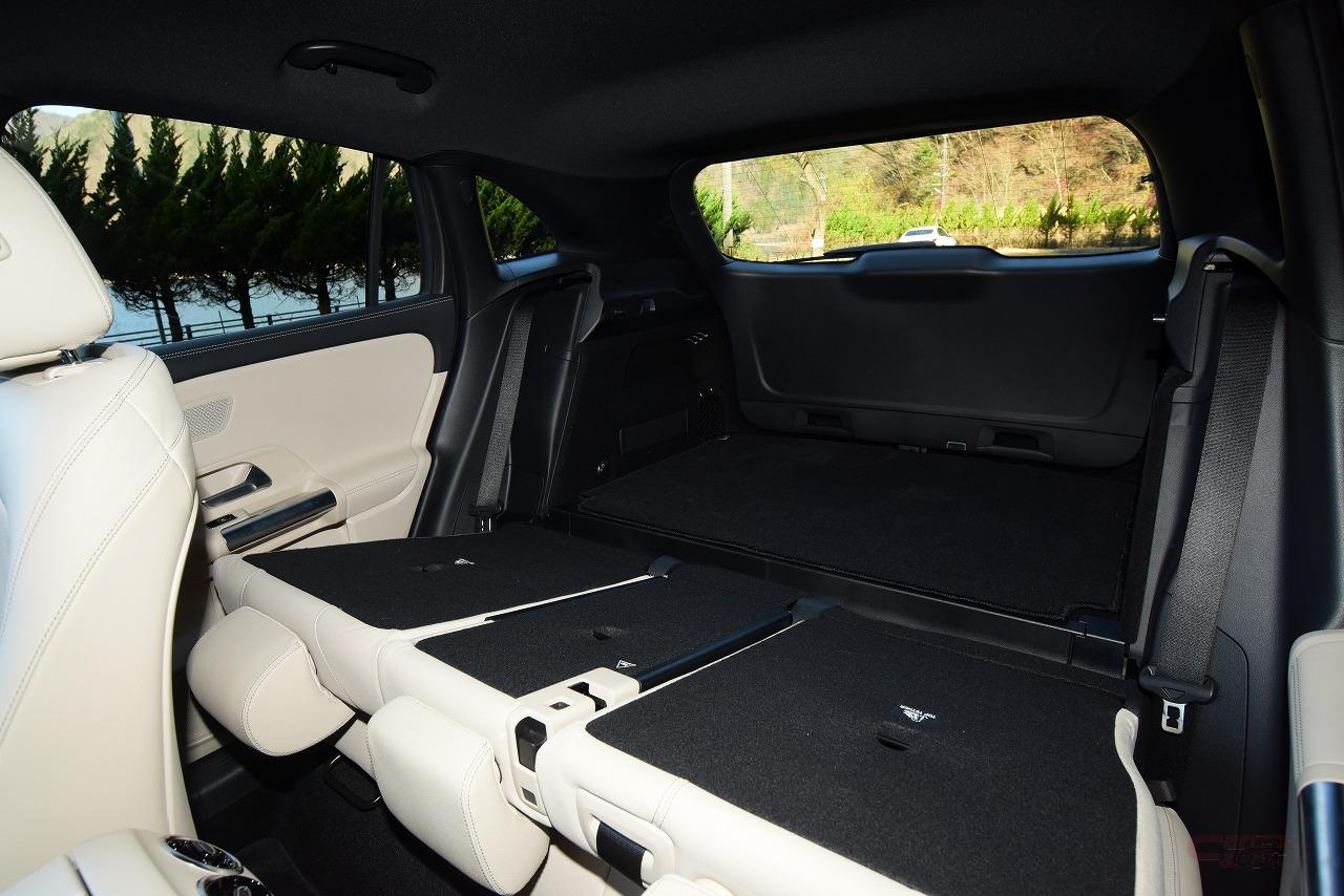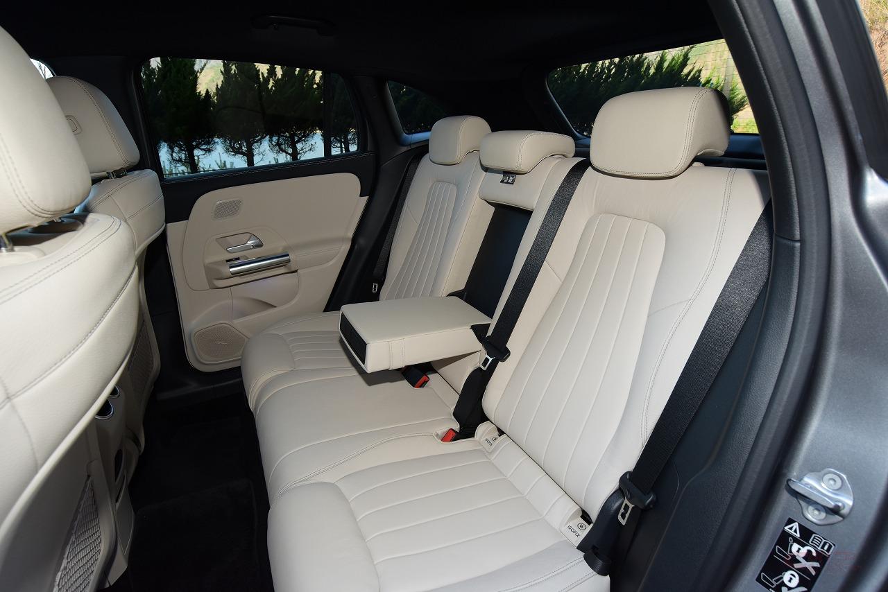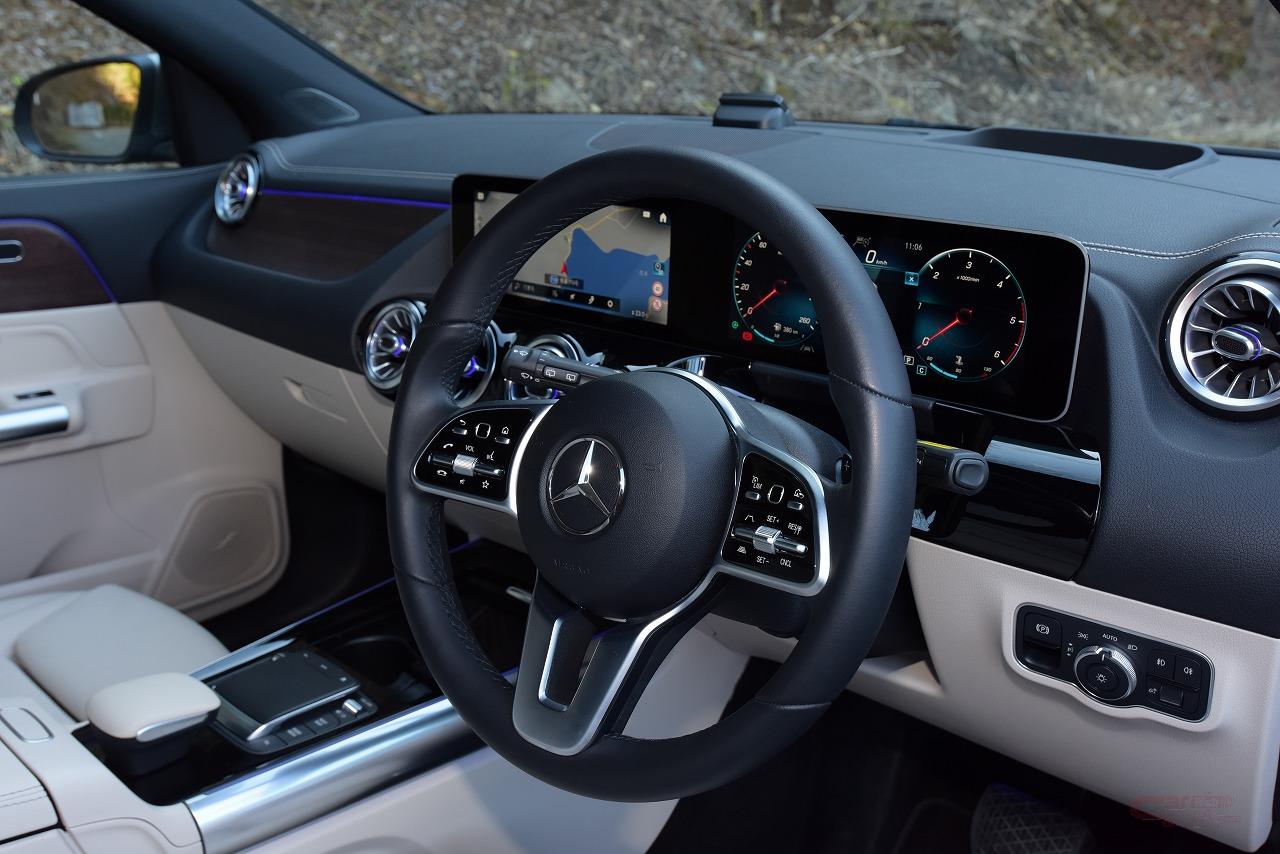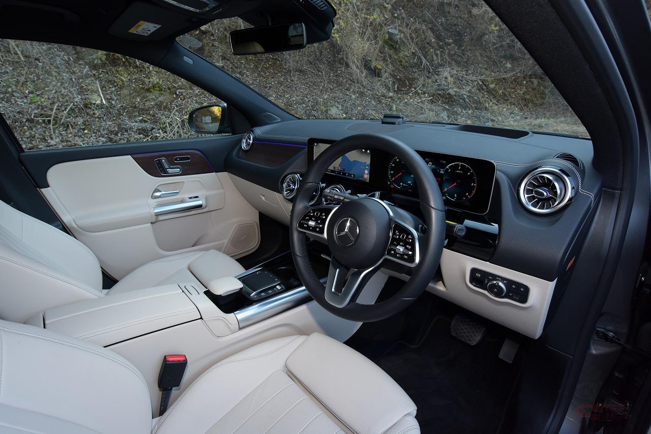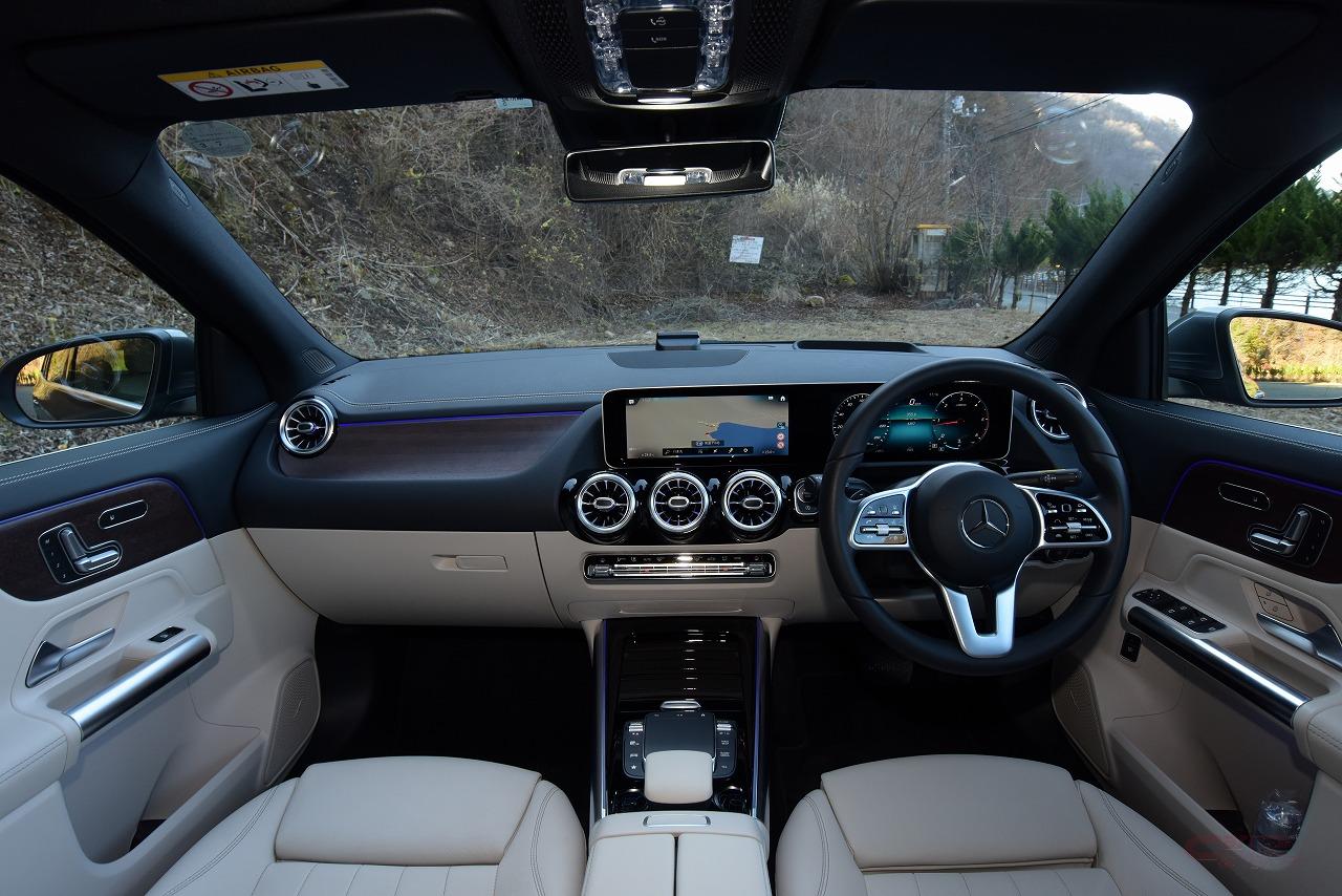 インテリアは、兄弟車のGLBやAクラスなどと同じく、メルセデスの最新デザインコンセプトに則っている。二つのディスプレイが並列した横長のディスプレイをはじめ、ジェットタービンを模したエアコン吹き出し口や、64色から選択できるアンビエントライトなどが先進的なイメージを与えている。