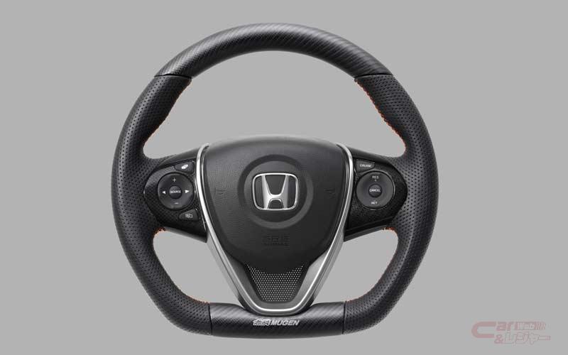 「S660」専用設計のスポーツステアリング。上部と下部をカーボン製をし、スポーティなデザインを採用。カーボンはマットな質感にすることでフロントウインドウへの反射を軽減。左右には本革パンチング加工により滑りにくい構造としている。グリップ分の太さや形状を変更し、スポーツ走行から一般走行まで様々なドライブシーンを想定し、形状、材質にこだわり抜いた無限オリジナルデザイン。ステッチに無限のコーポレートカラーである「ホワイト」「レッド」「ゴールド」の糸を採用。