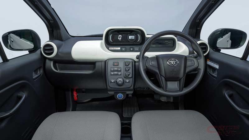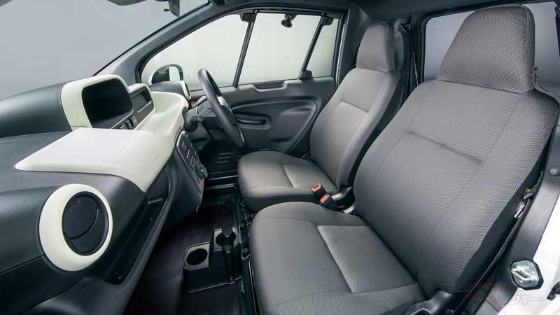 - 1,100mmの室内幅に、大人2人が並んで座れるシンプルな室内空間を実現。インストルメントパネルには、メーターを中心とする機能系装備をホワイトのセンタートレイ上に配置。ブラックを基調とするインテリアとのコントラストにより、実際のサイズ以上に広さを演出。スイッチ類もセンターパネルに集約し、人にやさしい操作性を実現