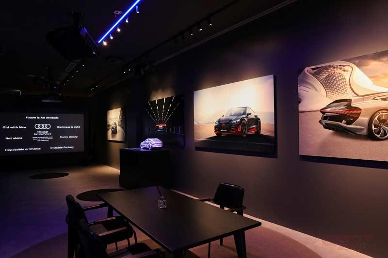 アウディブランドの歴史や哲学、アウディモデルのデザインに込められた想いなどを、まったく新しい方法で体験することが可能で、プロジェクションマッピングとジェスチャーコントロールを組み合わせて拡張現実(AR)のように本を読む体験や、壁に書かれたワードを指さすとその位置をセンサーで検知し、その言葉に関連してアウディからの未来へ向けたメッセージが紹介されるアトラクション、車の三次元模型にプロジェクションマッピングでデザイン哲学を表現するなど、最新の表現方法とタッチレスのインターフェイスを駆使したものとなっているという。