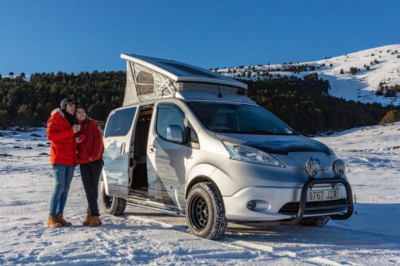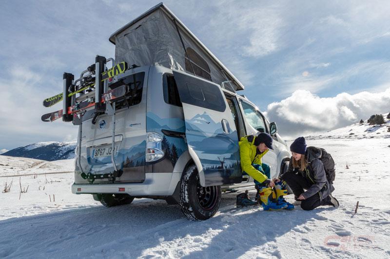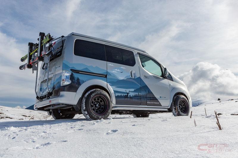 コンセプトバン「e-NV200 Winter Camper concept」は、100%電気LCV(小型商用車)である「e-NV200」をベースとし、環境への影響を最小限に抑えながら、この車専用に施された改良によって、雪道での走破性性能を高めるとともに、キャンプシーンでの高い利便性を実現したモデルとなる。