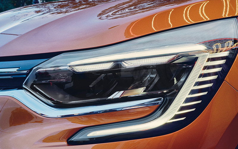 ヘッドライトは 100%LED 化され、ルノーモデルを象徴するライトシグネチャーのCシェイプ デイタイムランプが装備されており、ヘッドライトユニットには、フロントグリルからライトユニット内に続くクロームモールと一体となった「目」を思わせるふたつの造形と、「まつ毛」を思わせる立体的なストライプが組み込まれている。リアライトにも、ルノーモデルの象徴である C シェイプのライトシグネチャーが備わっており、リアエンドのデザイン上のアクセントとなっている。